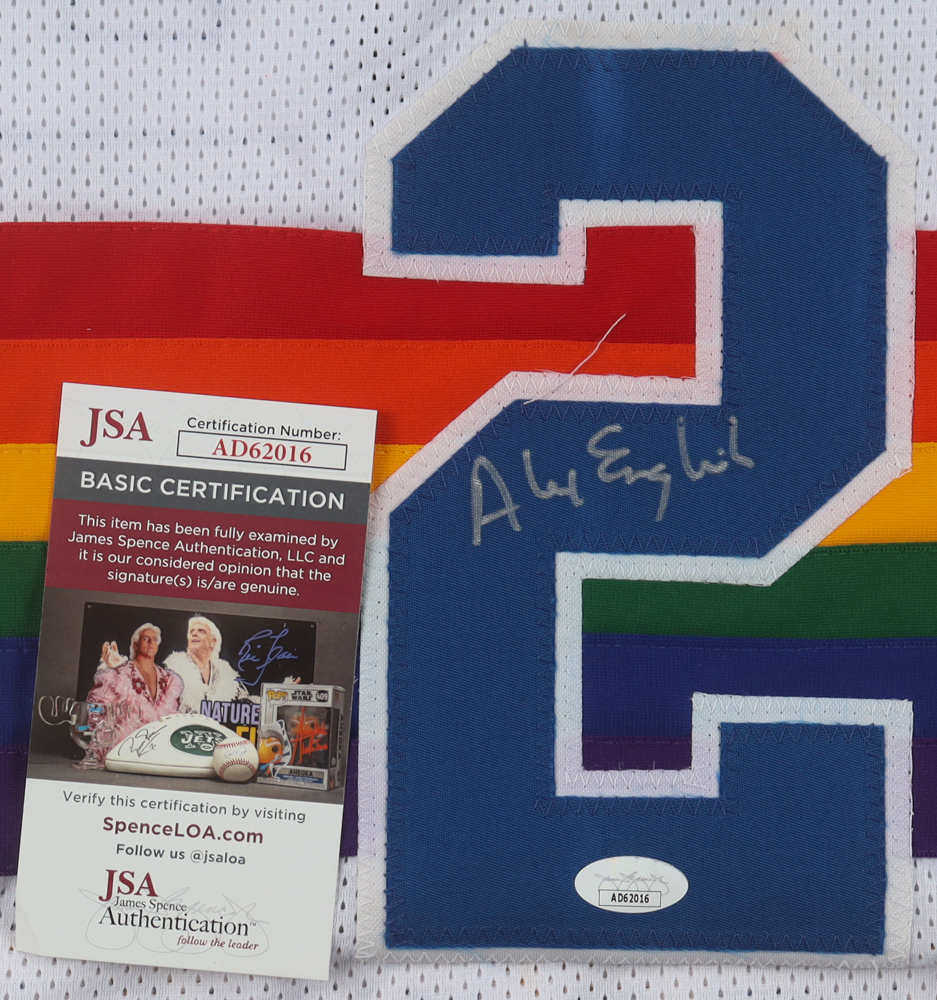 Custom jersey with everything sewn on, size XL. Hand-signed by Alex English (HOF).