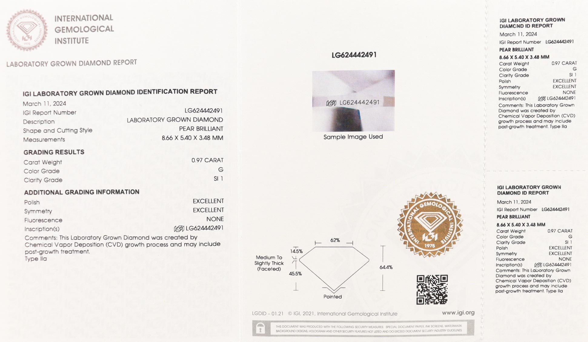 This piece includes paperwork from the International Gemological Institute (IGI).