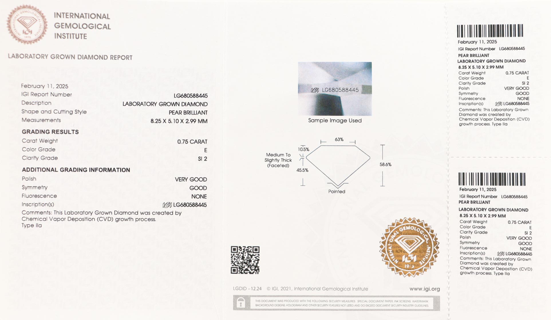 This piece includes paperwork from the International Gemological Institute (IGI).