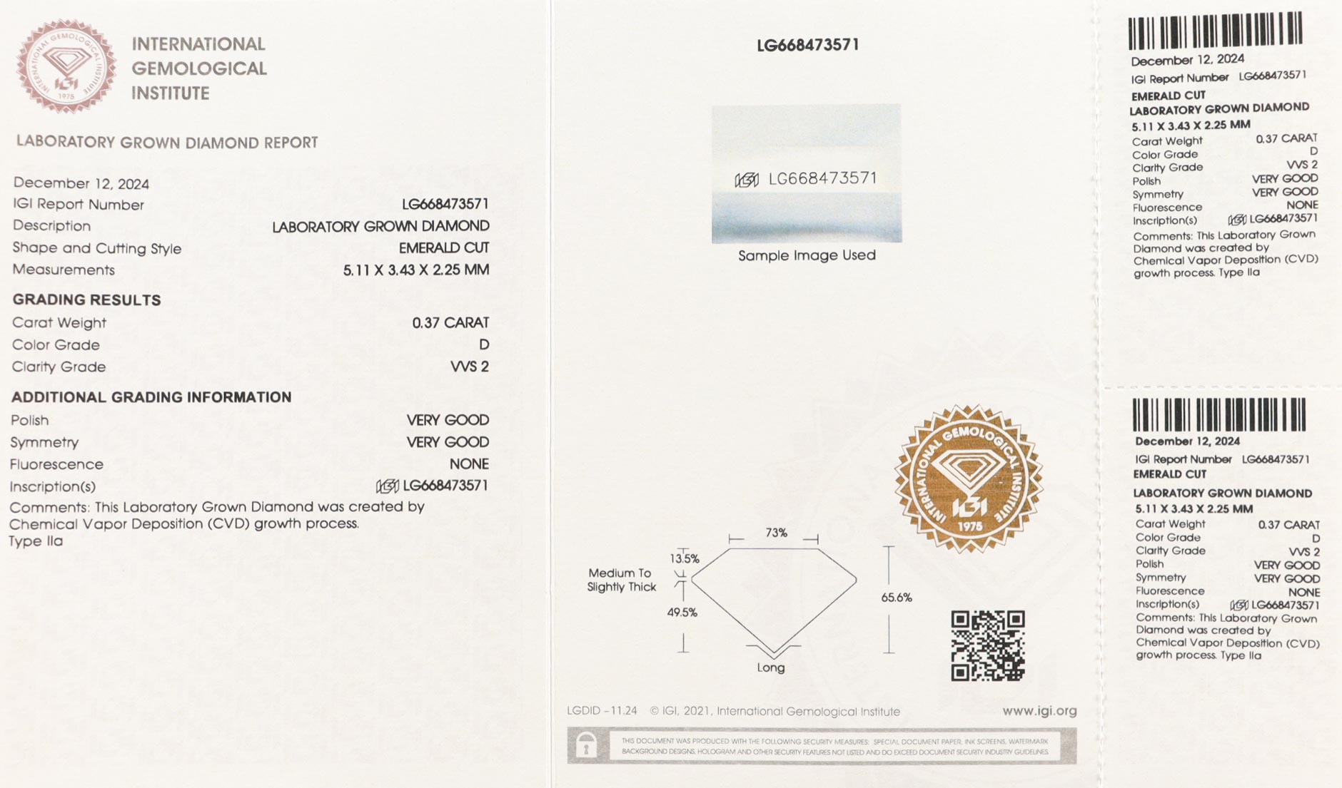 This piece includes paperwork from the International Gemological Institute (IGI).