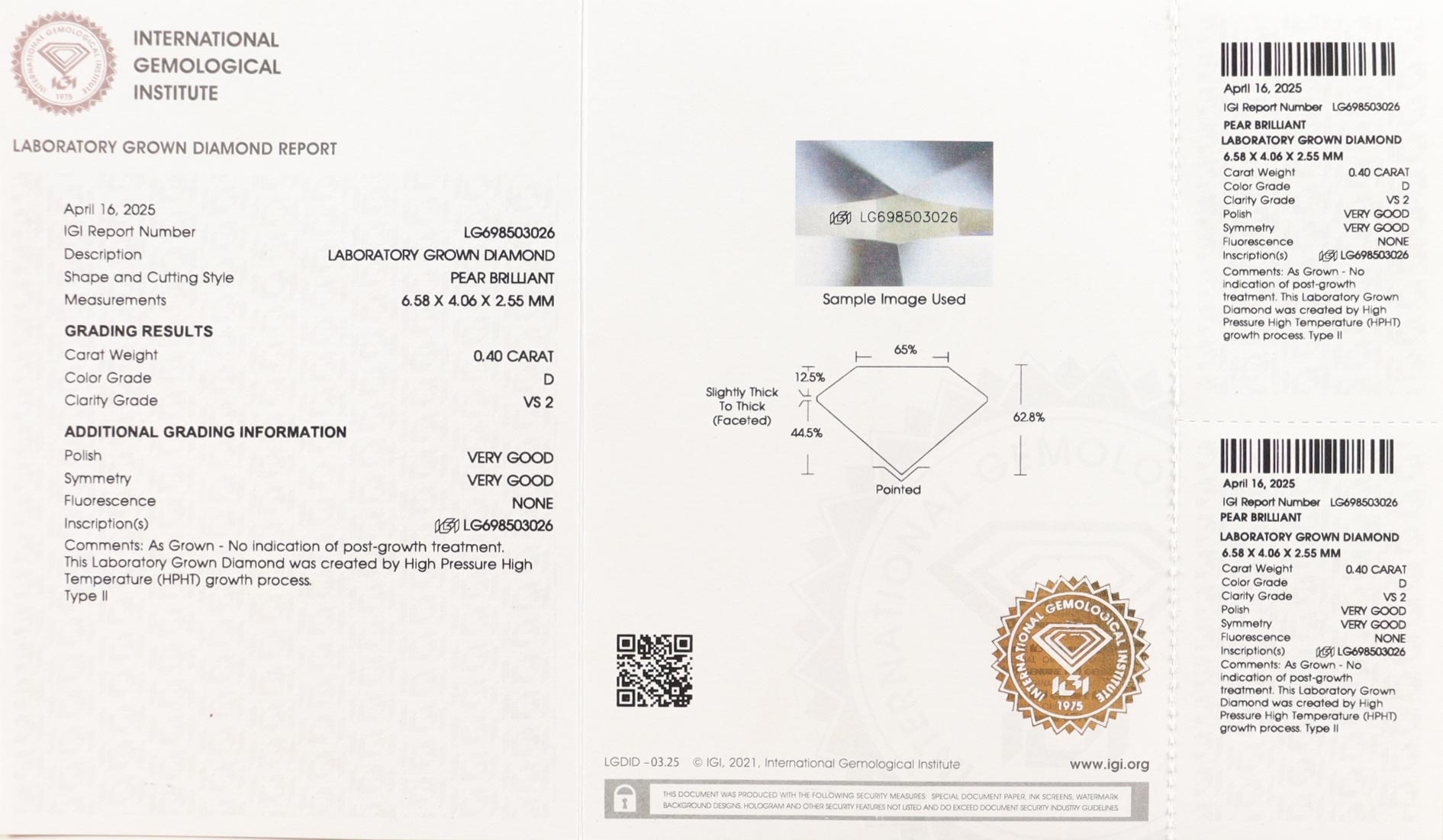 New .40 Carat Loose Lab Grown Diamond D, VS 2 (IGI)