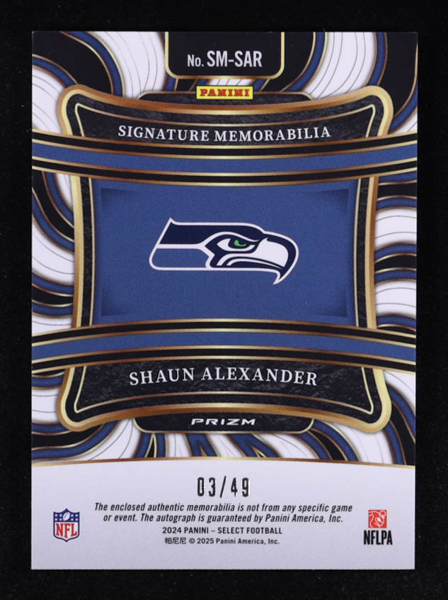 Shaun Alexander 2024 Select Signature Memorabilia Prizm Blue #4 #03/49