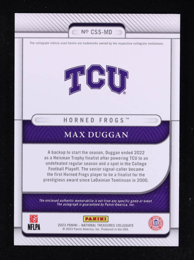 Max Duggan 2023 Panini National Treasures Collegiate College Silhouettes Signatures Blue #32 #39/49 RC