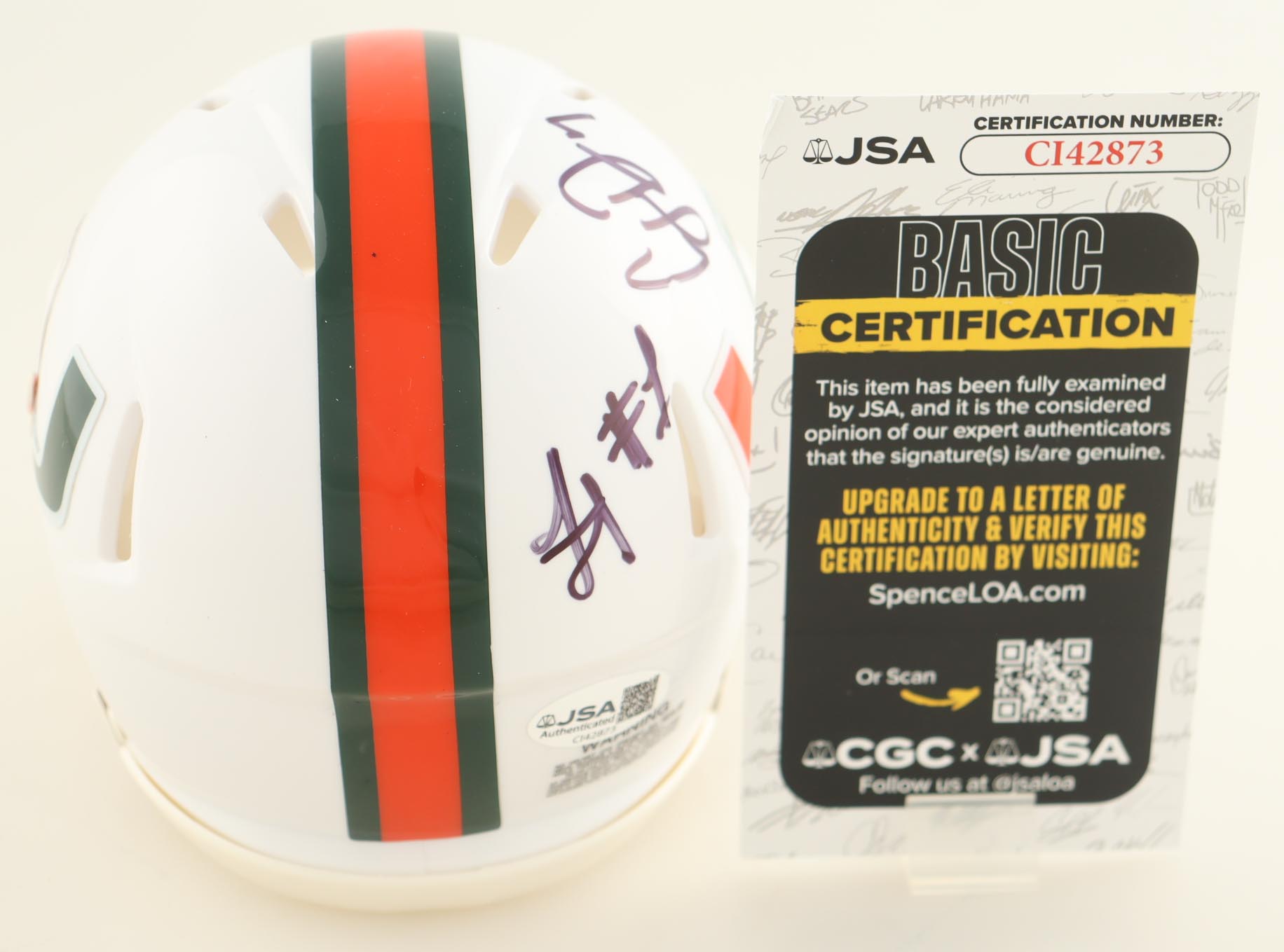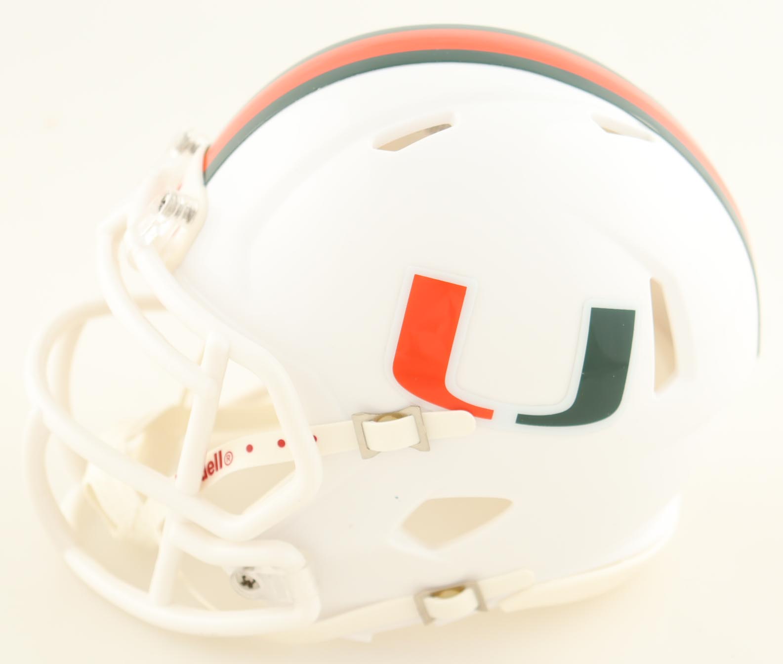 Riddell Miami Hurricanes speed mini helmet has been hand-signed by Malachi Toney, CJ Daniels and Jojo Trader.