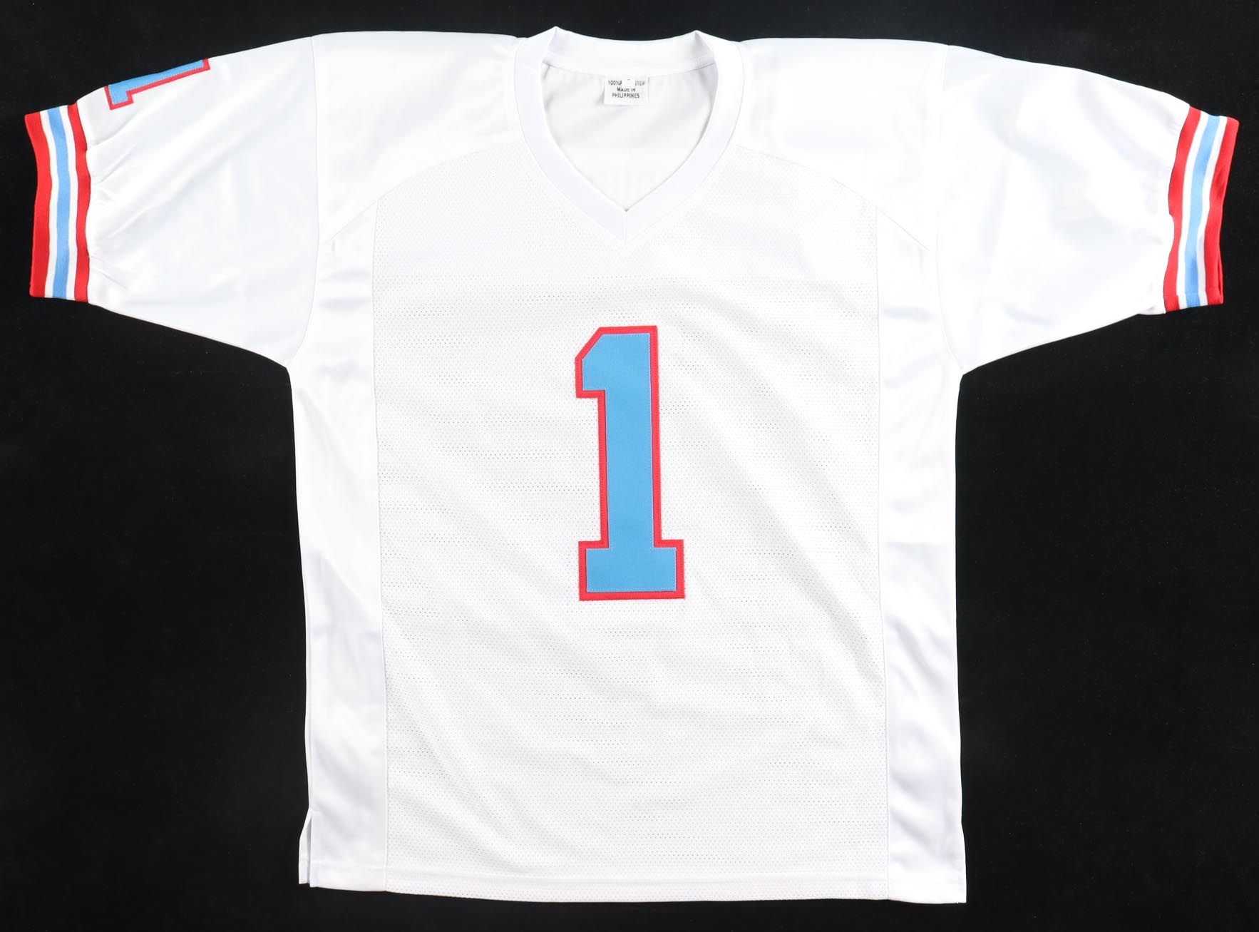 Custom jersey with everything sewn on, size XL. Hand-signed and inscribed by Warren Moon (HOF).