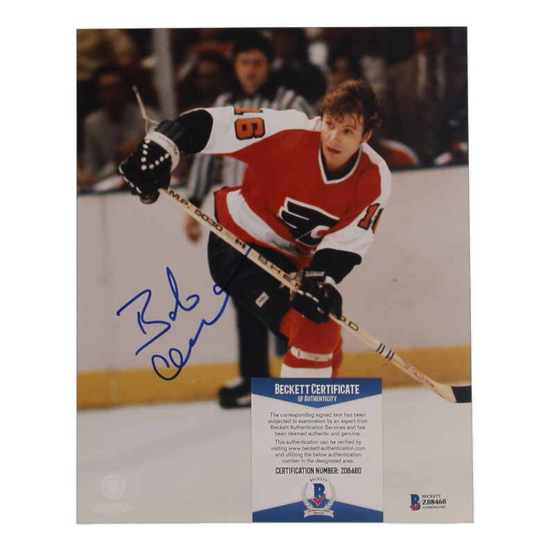 Photo measures 8" x 10" in size and has been hand-signed by Bob Clarke (Philadelphia Flyers, HOF)