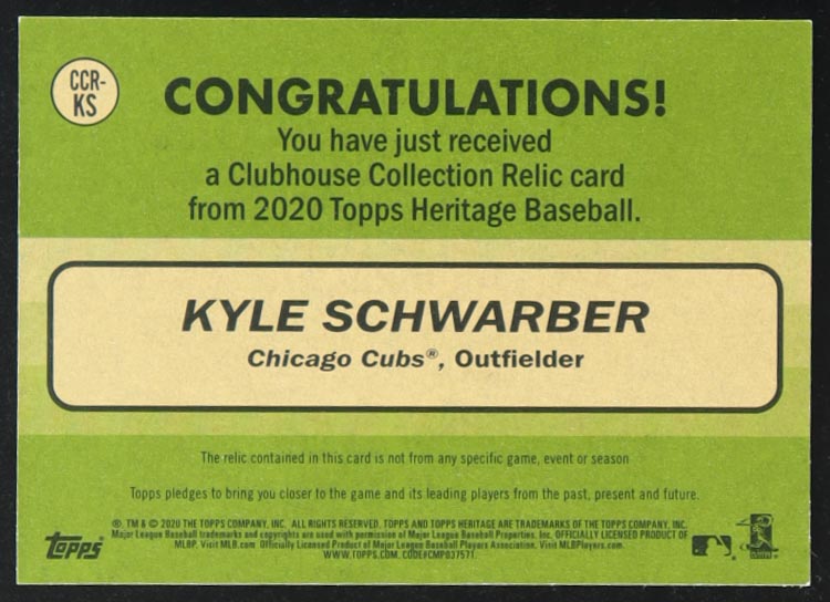 Kyle Schwarber 2020 Topps Heritage Clubhouse Collection Relics #CCRKS