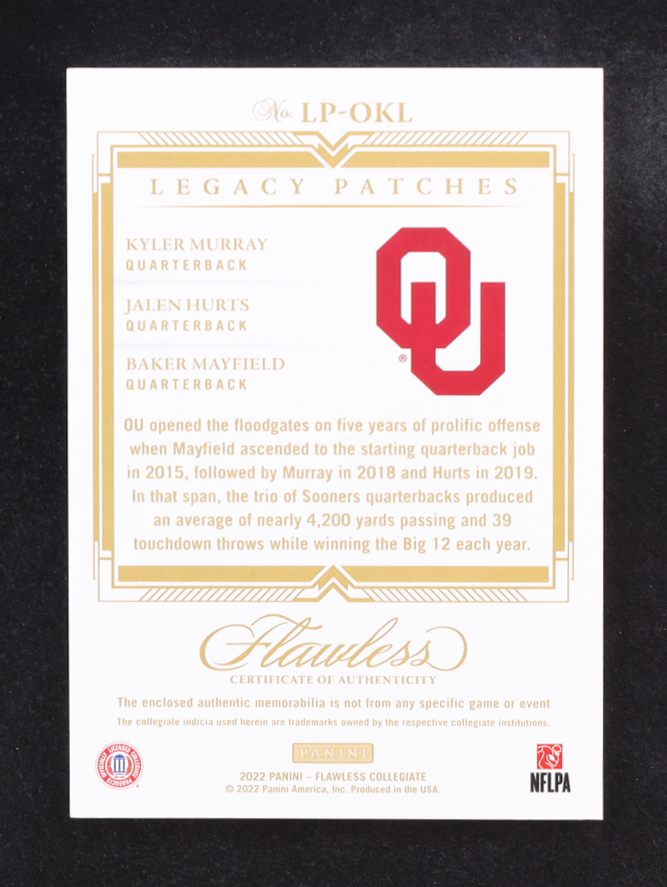 Jalen Hurts / Kyler Murray / Baker Mayfield 2022 Panini Flawless Collegiate Legacy Patches Ruby #1 #19/20