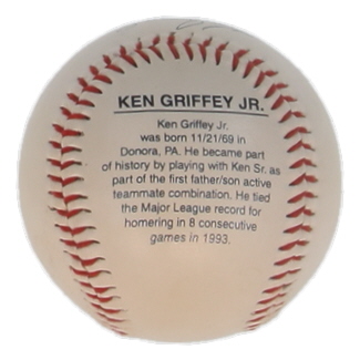 Commemorative Baseball features Ken Griffey Jr. (Seattle Mariners, HOF). Please note, there are stains throughout the baseball and the signature is a facsimile.