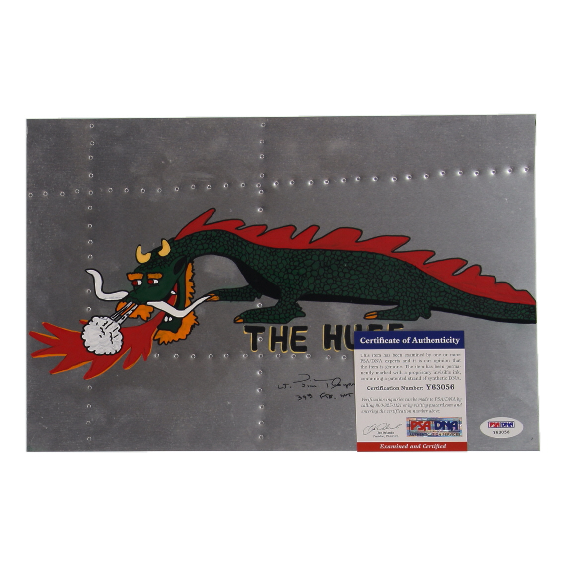 This remarkable piece of hand-painted nose art is both a unique tribute to Korean War aviation and a signed artifact from one of its noted pilots. Featuring the **striking dragon insignia of ""The Huff""** and the authentic signature of **Lt. Jim Thompson**, it captures a vivid piece of history when jet-powered dogfighting first came into its own. Authenticated by **PSA/DNA**, this display-ready panel is a must-have for collectors of military aviation memorabilia."