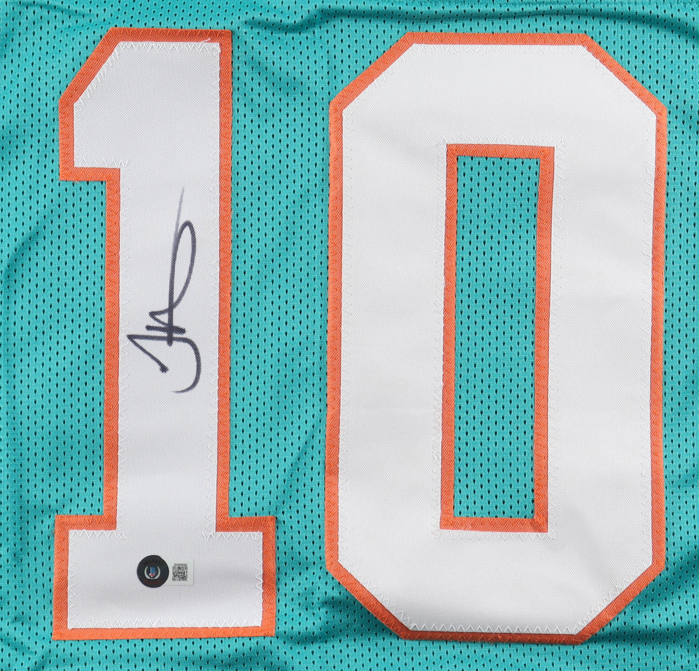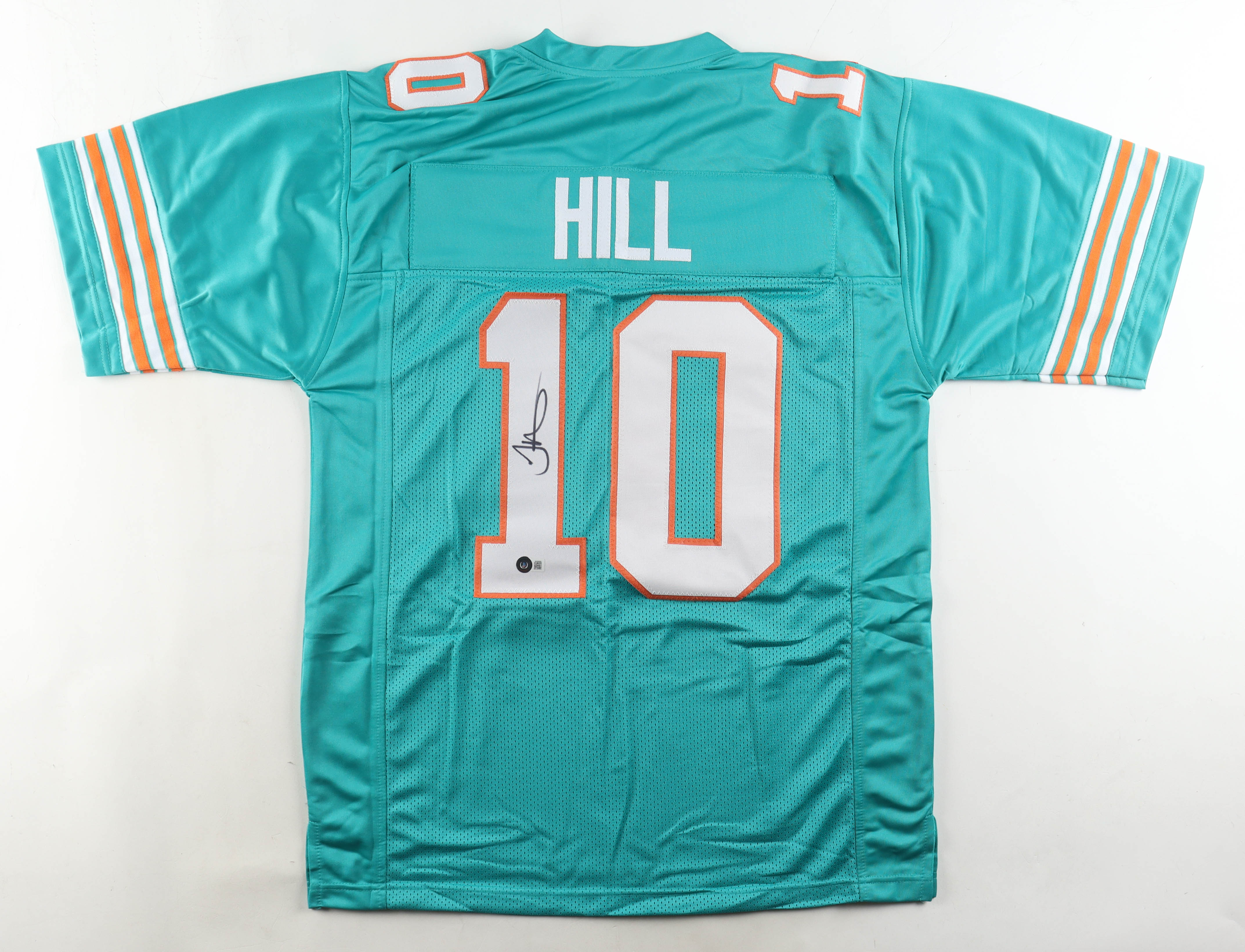 Custom jersey with everything sewn on, size XL. Hand-signed by Tyreek Hill (Miami Dolphins).