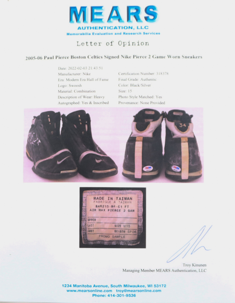 Paul Pierce Twice-Signed Game-Used Pair of 2005 Nike Basketball Shoes (PSA & Mears)