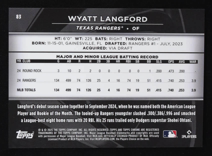 Wyatt Langford 2025 Topps Chrome Black Green Wave Refractors #83 #39/99