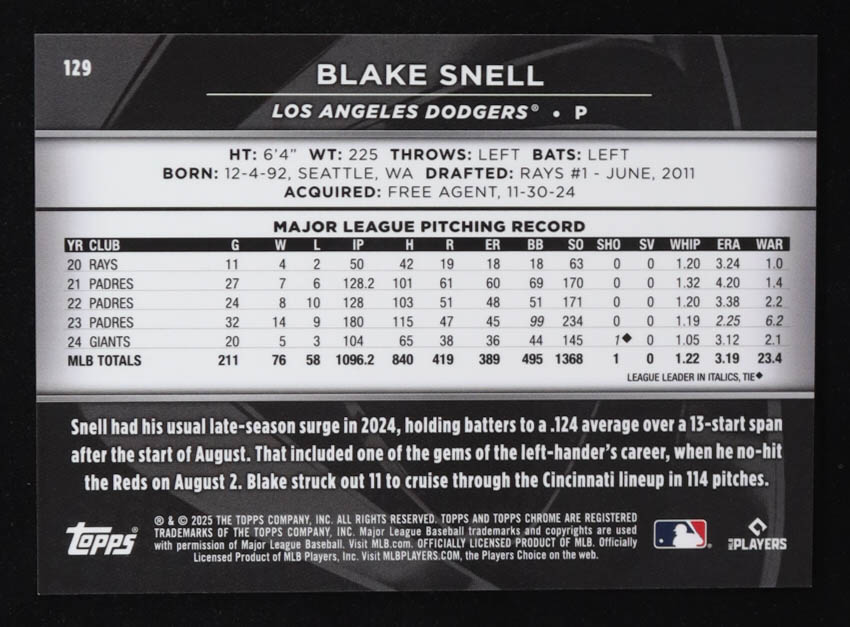 Blake Snell 2025 Topps Chrome Black Gold Refractors #129 #18/50