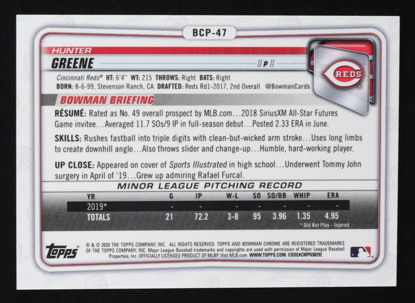 Hunter Greene 2020 Bowman Chrome Prospects Aqua Refractors #BCP47 #076/125