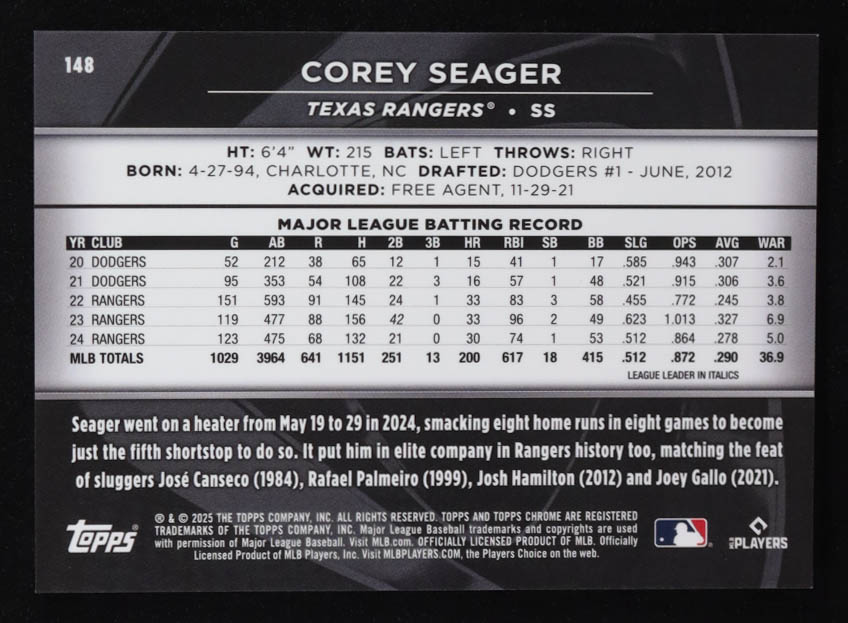 Corey Seager 2025 Topps Chrome Black Purple Mini-Diamond Refractors #148 #72/75