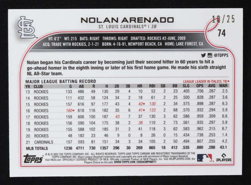 Nolan Arenado 2022 Topps Chrome Ben Baller Orange Refractors #74 #10/25