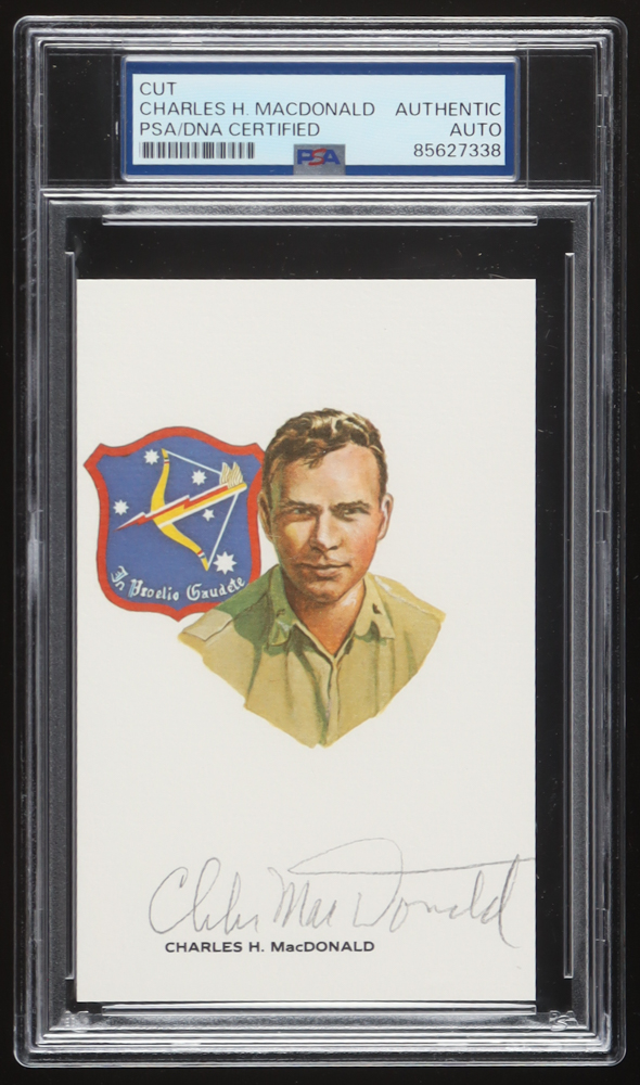 Presented is a scarce hand-signed cut signature of Brigadier General Charles H. “Mac” MacDonald (1914–2002), executed in pencil. The autograph has been authenticated and encapsulated by PSA/DNA, ensuring both verification and long-term preservation.