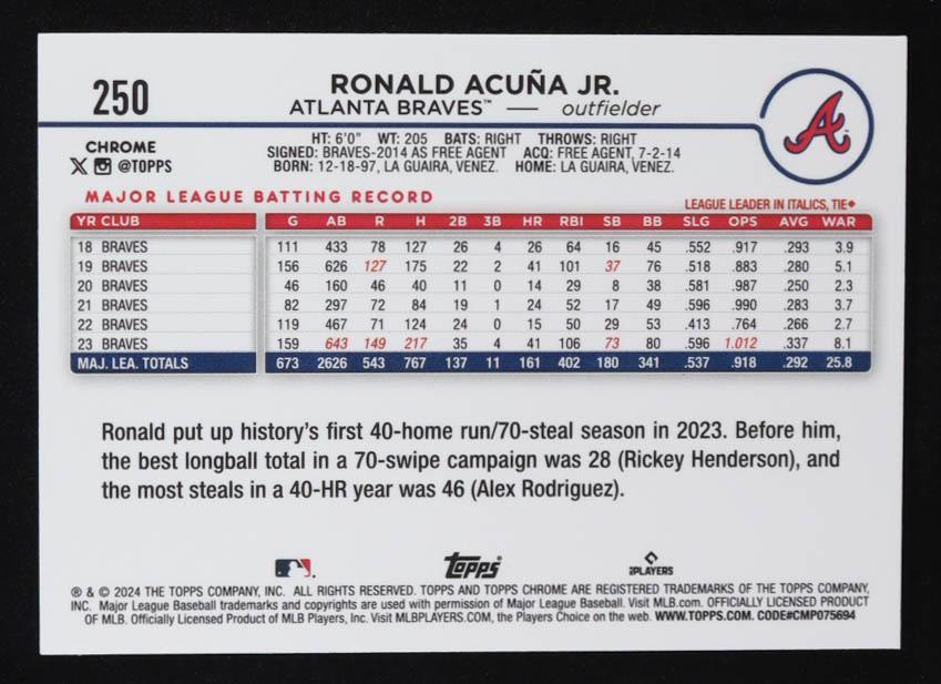 Ronald Acuna Jr. 2024 Topps Chrome Blue Sonar Refractors #250 #096/125
