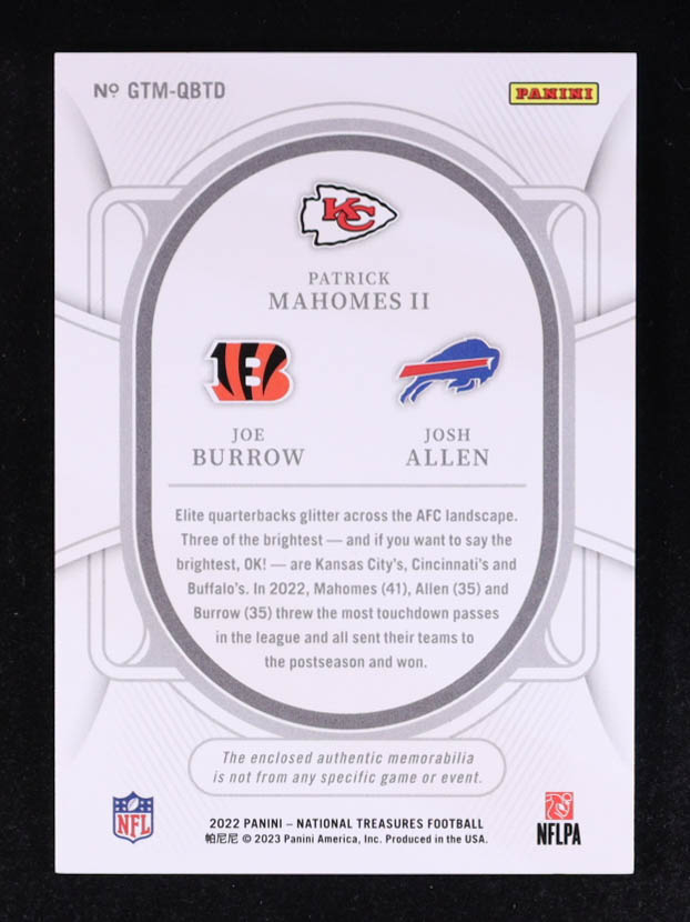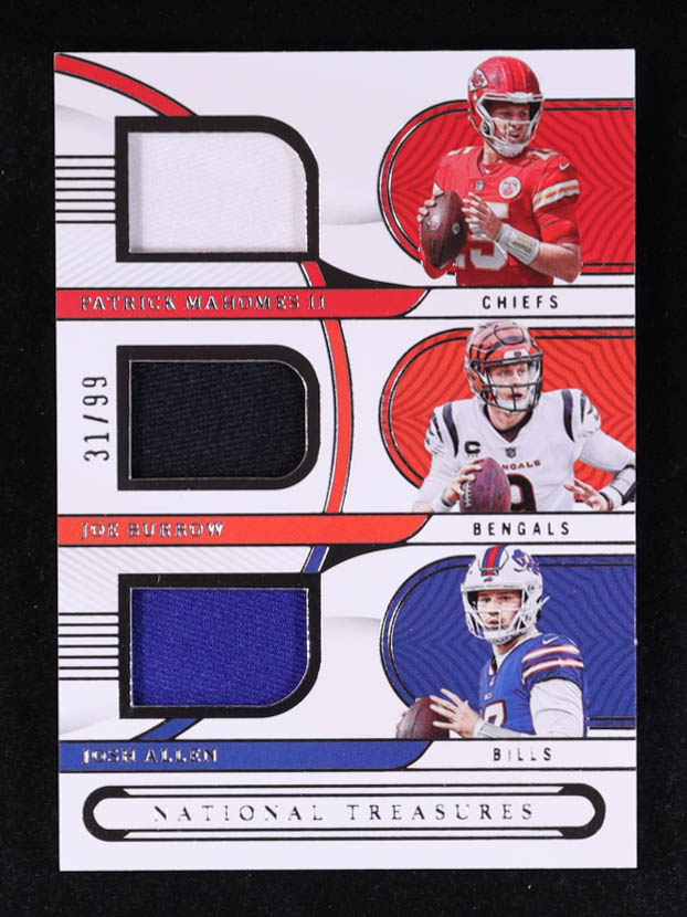 Patrick Mahomes II / Joe Burrow / Josh Allen 2022 Panini National Treasures NFL Gear Trio Materials #10 #31/99