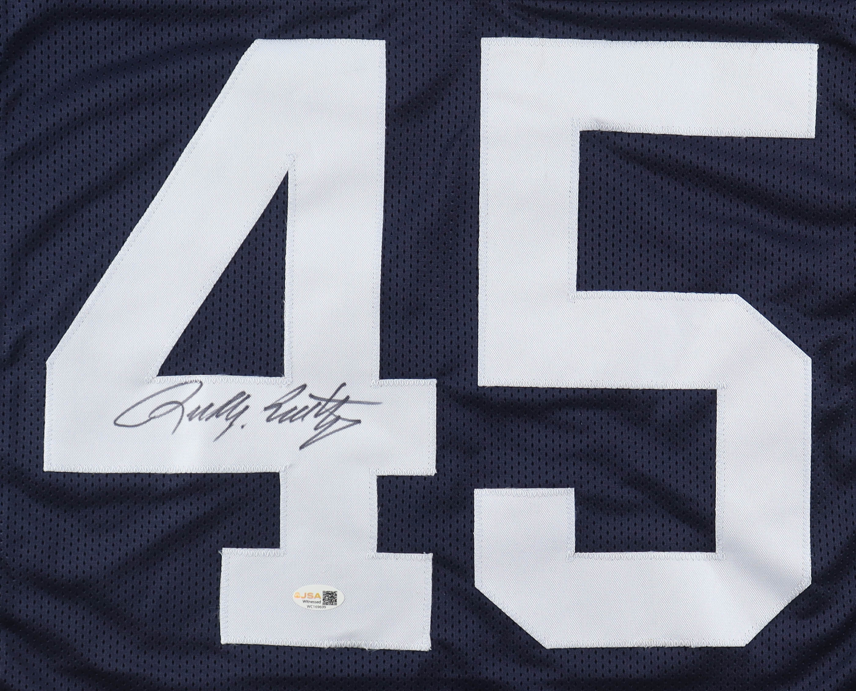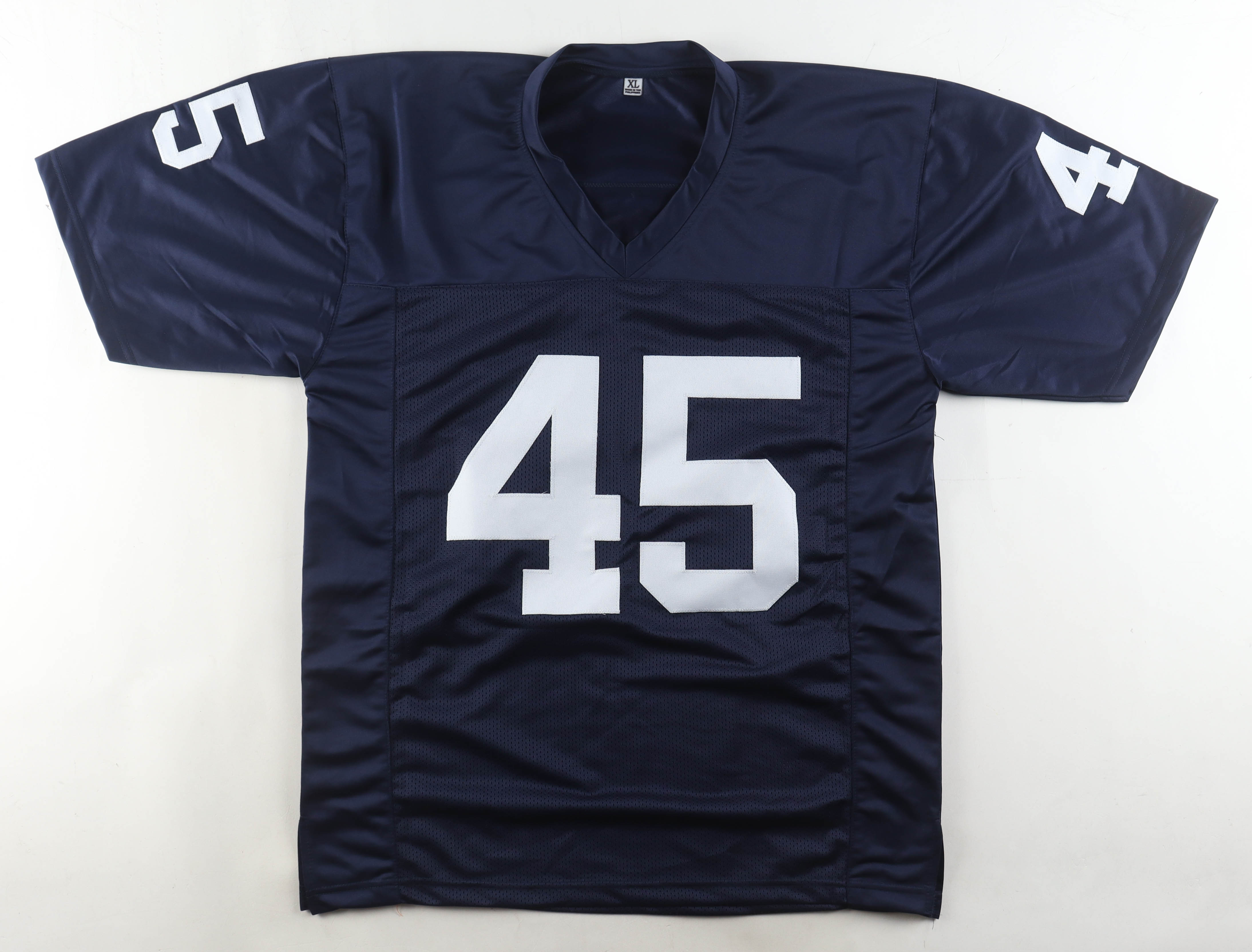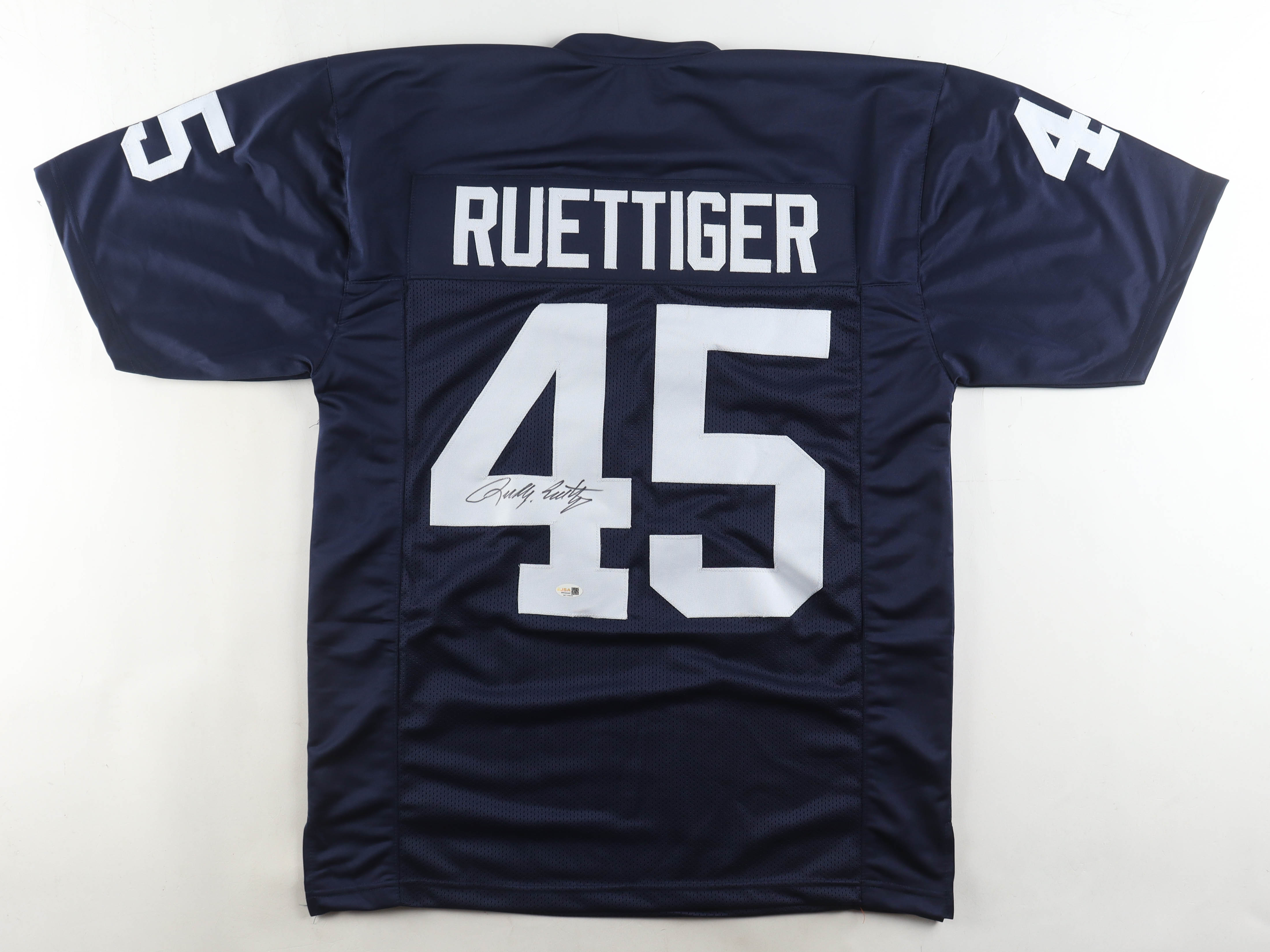 Custom jersey with everything sewn on, size XL. Hand-signed by Rudy Ruettiger. Please note, there is staining on the reverse number.