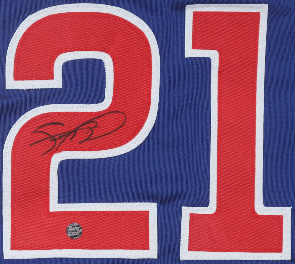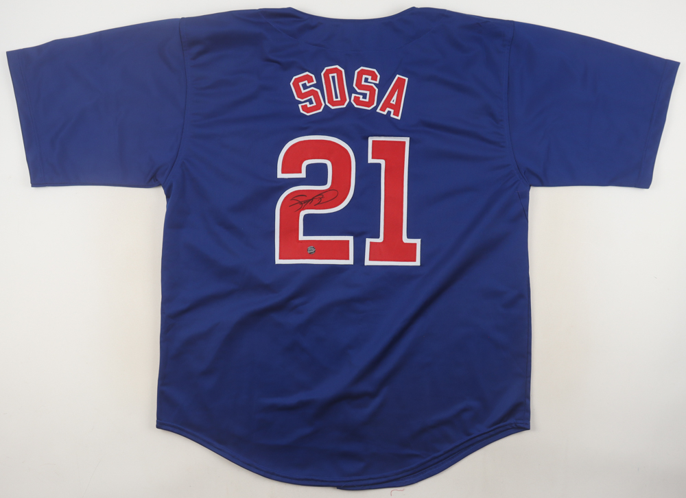 Custom jersey with everything sewn on, size XL. Hand-signed by Sammy Sosa.