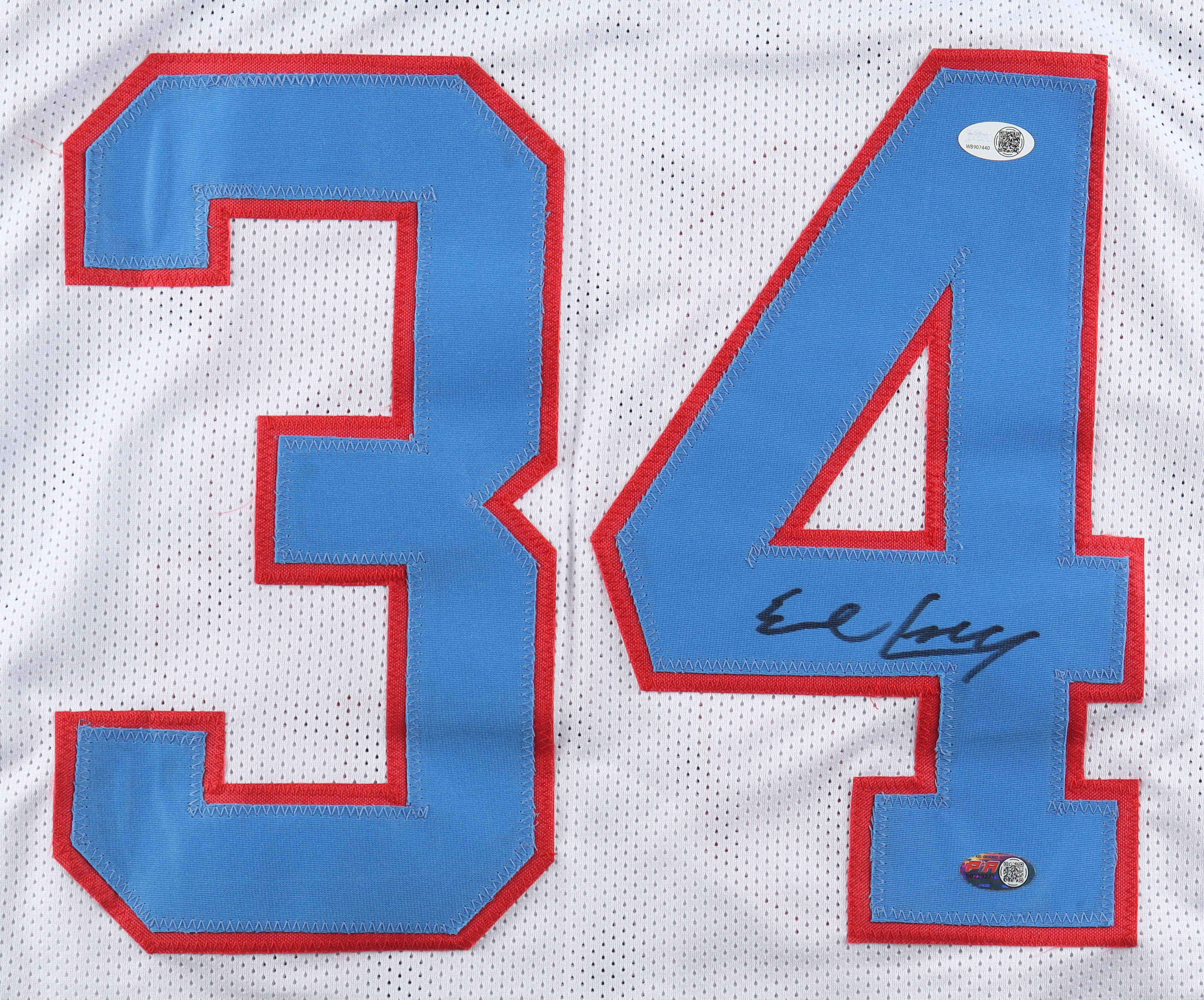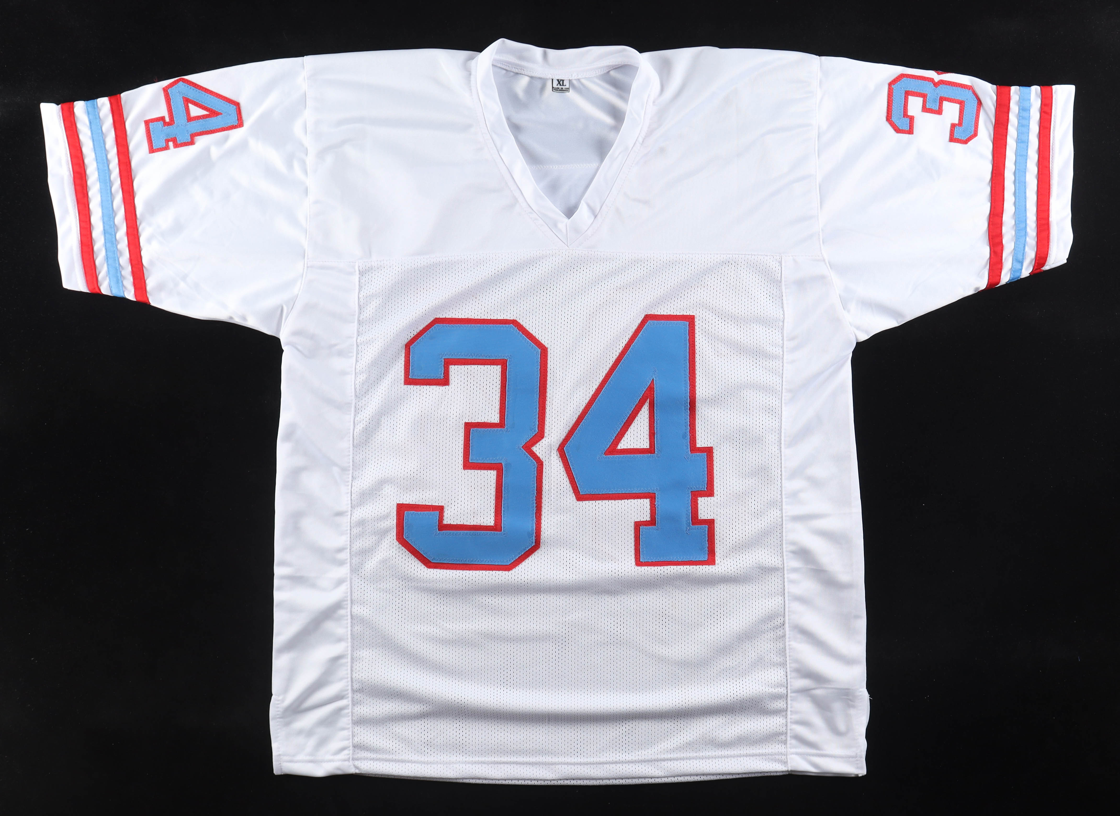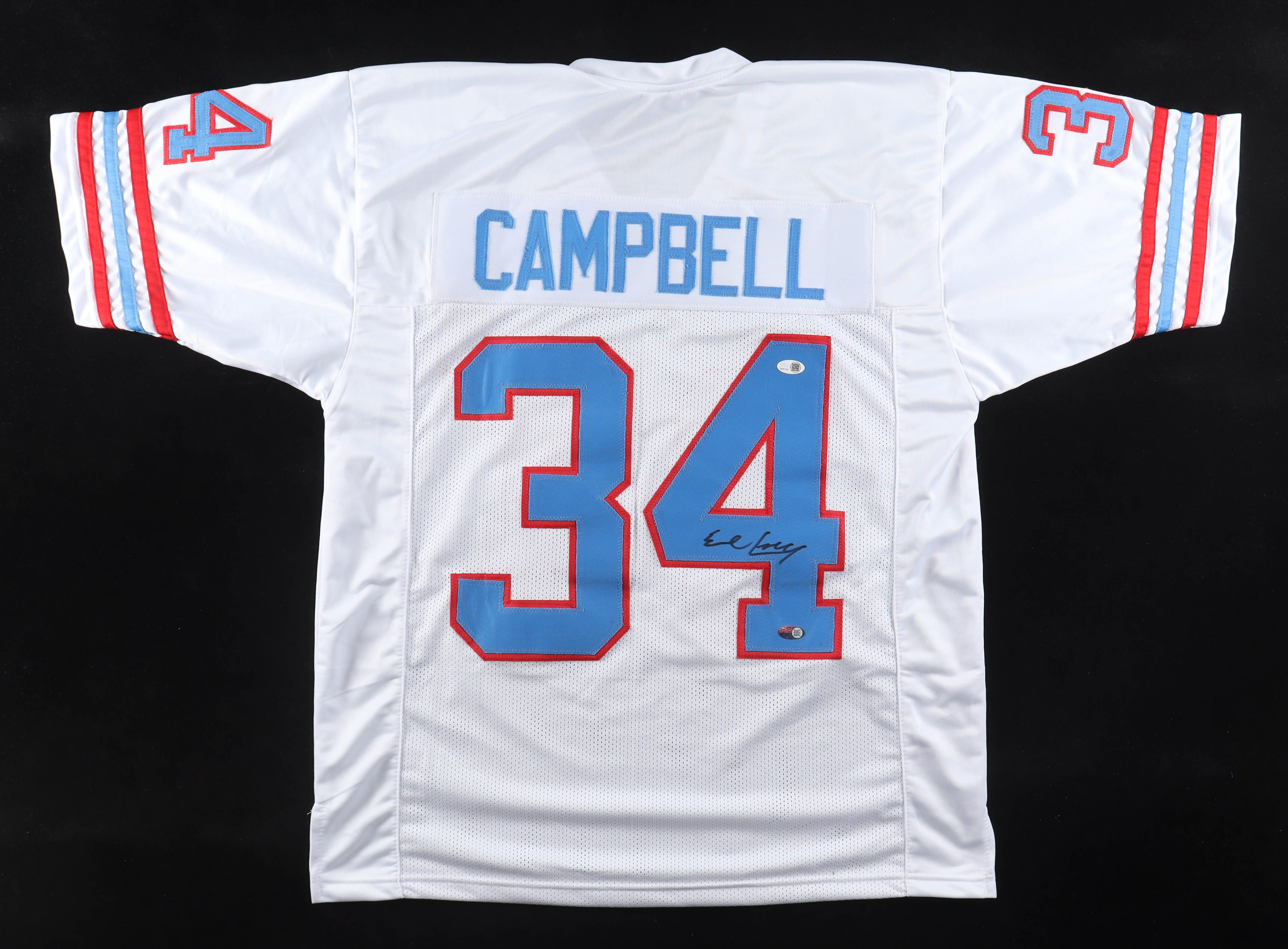 Custom jersey with everything sewn on, size XL. Hand-signed by Earl Campbell (HOF).