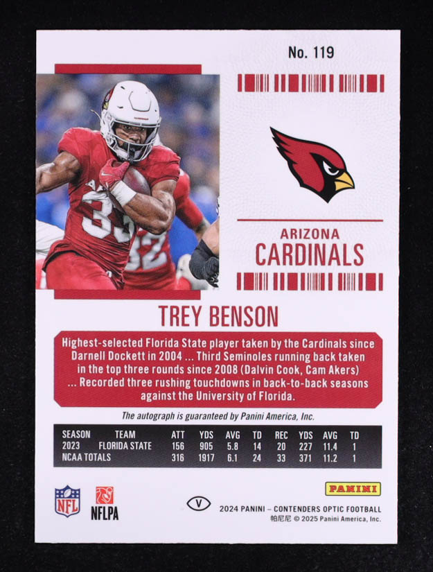 Trey Benson 2024 Panini Contenders Optic Prizm Rookie Ticket Autographs Silver #119 RC