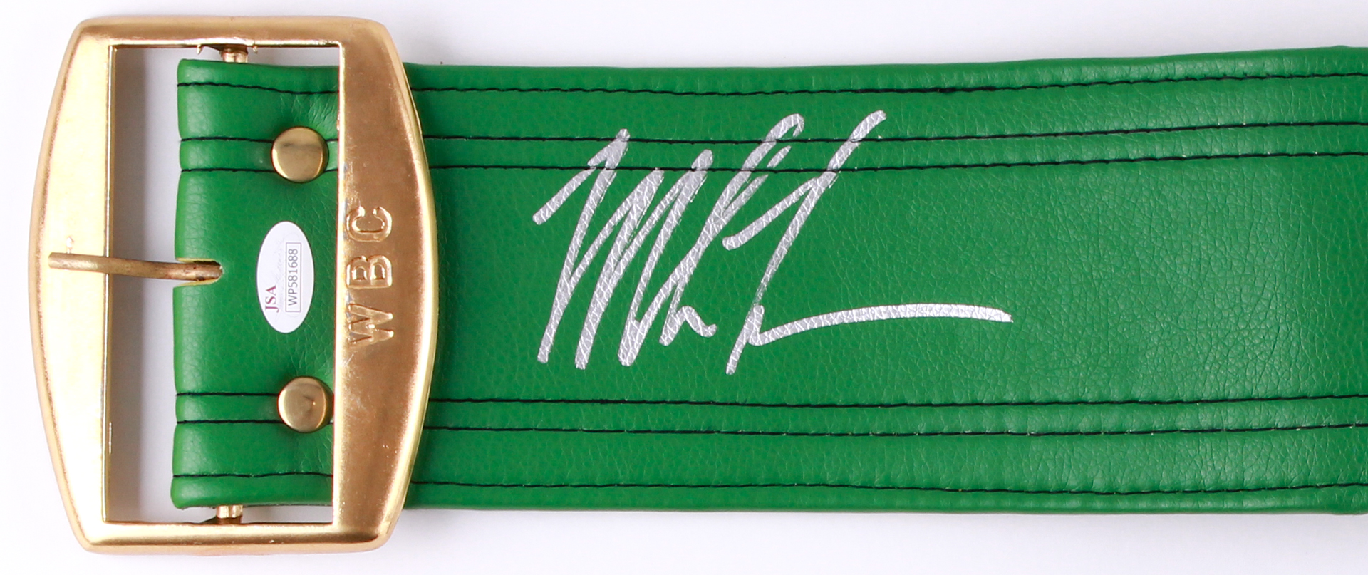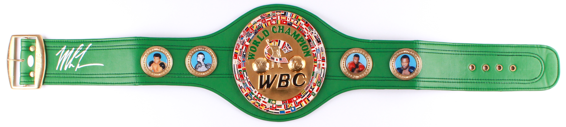 World Boxing Council (WBC) full-size high-quality replica belt (genuine leather with metal plates) has been hand-signed in silver paint pen by Mike Tyson (HOF). Belt measures approximately 50" in length.