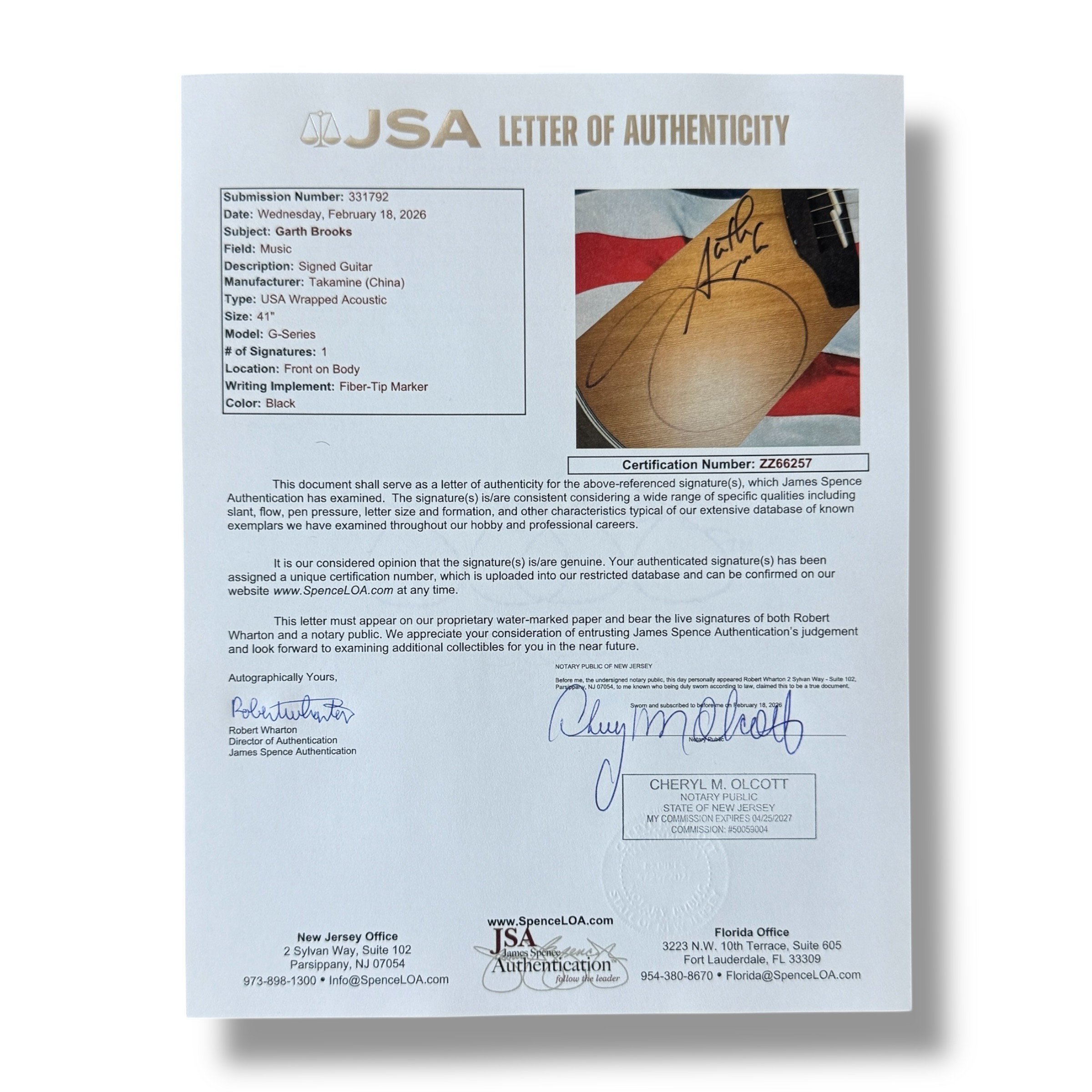 Full-Size Takamine G-Series Acousitc guitar measures approximately 41" in length and has been hand-signed on the guitar body by Garth Brooks with custom American Flag graphics.