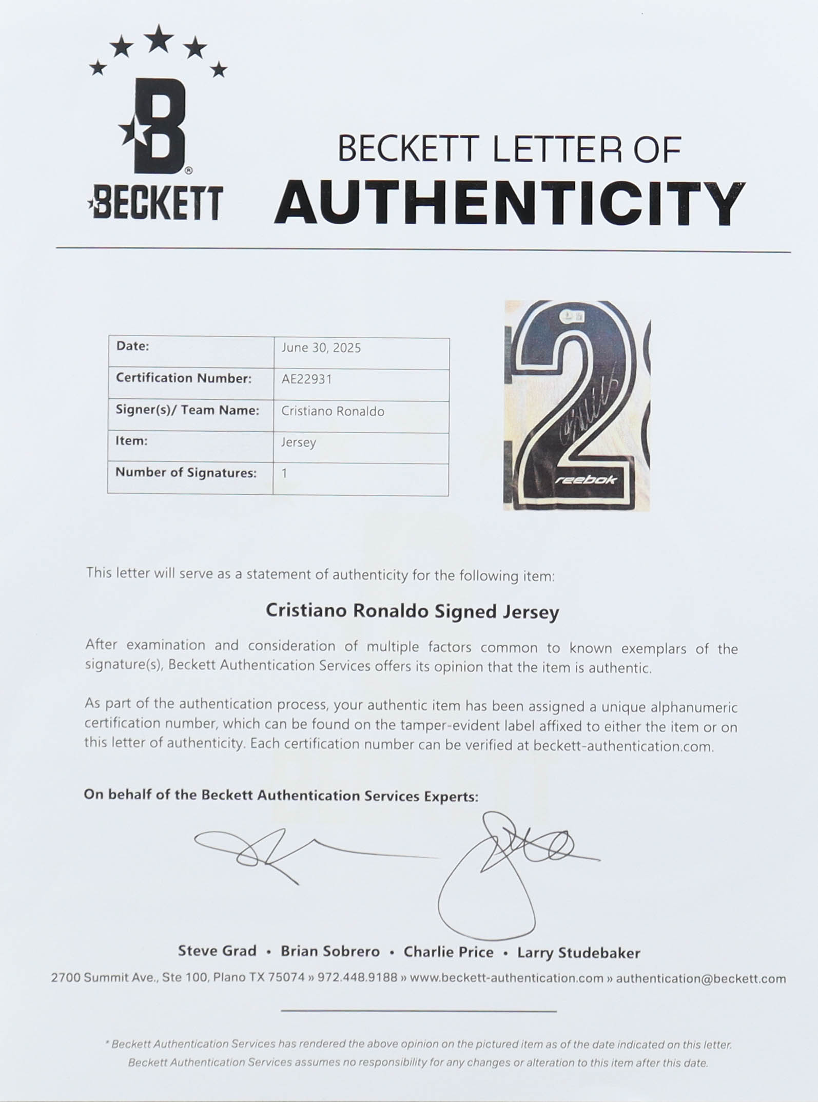 The autograph includes an official Beckett Authentication Services hologram and matching LOA for authenticity purposes.