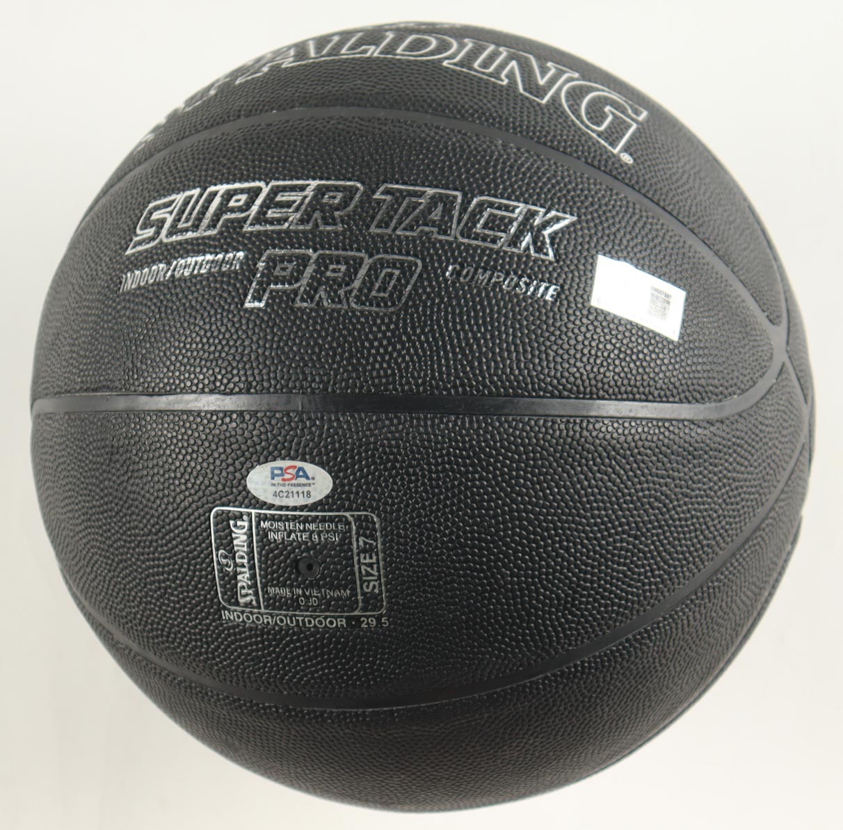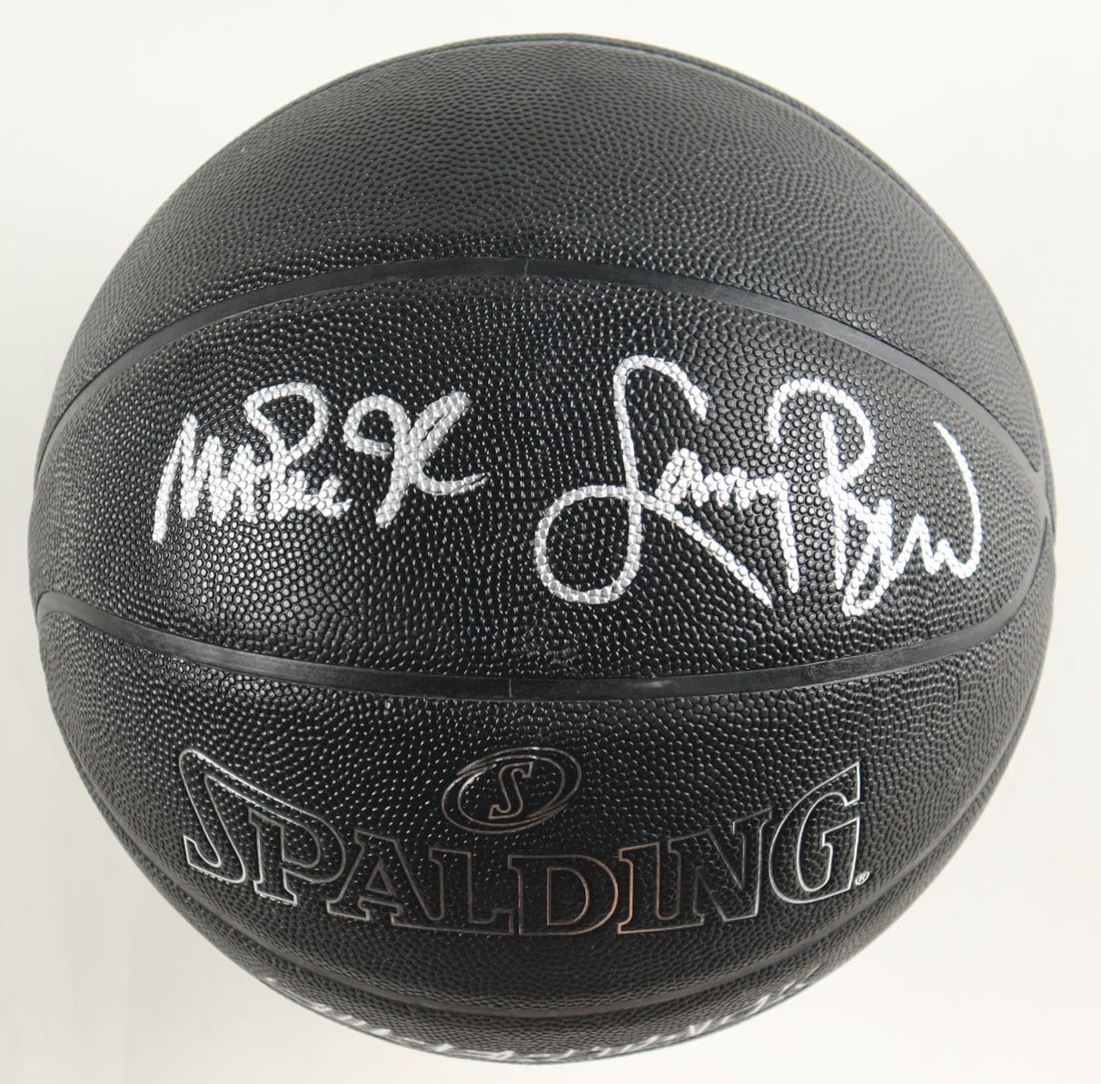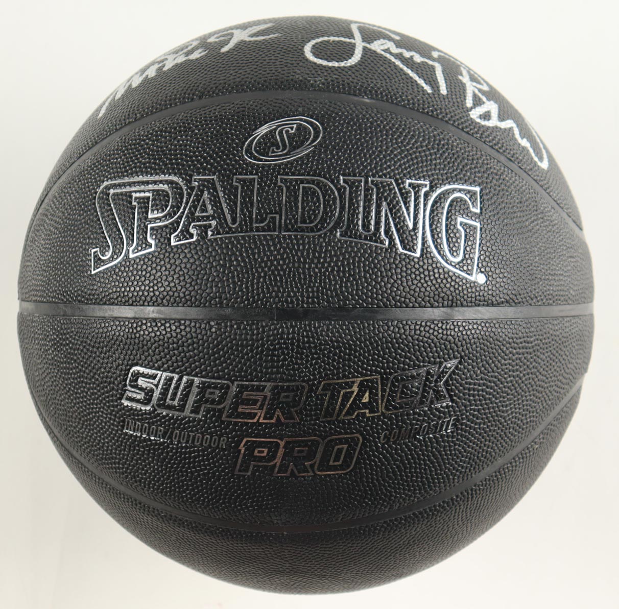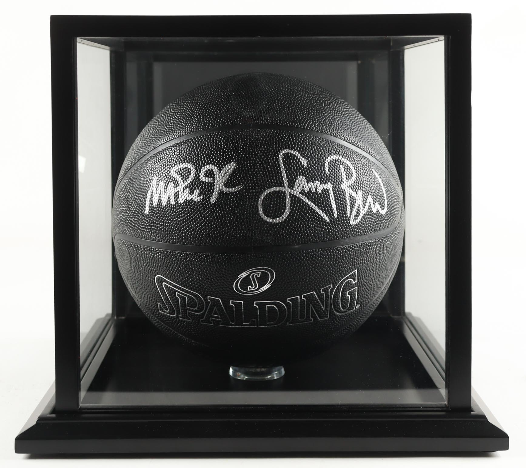 Spalding Black Super Tack NBA Basketball. Hand-signed by Magic Johnson (Los Angeles Lakers, HOF) and Larry Bird (Boston Celtics, HOF). The display display case is included as shown.