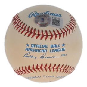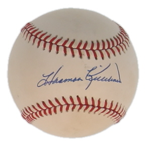 Rawlings Official American League baseball. Hand-signed by Harmon Killebrew (D. 2011, Minnesota Twins, HOF). Please note, the ball is naturally toned and stained throughout. See photos for more detail regarding the condition of the item.