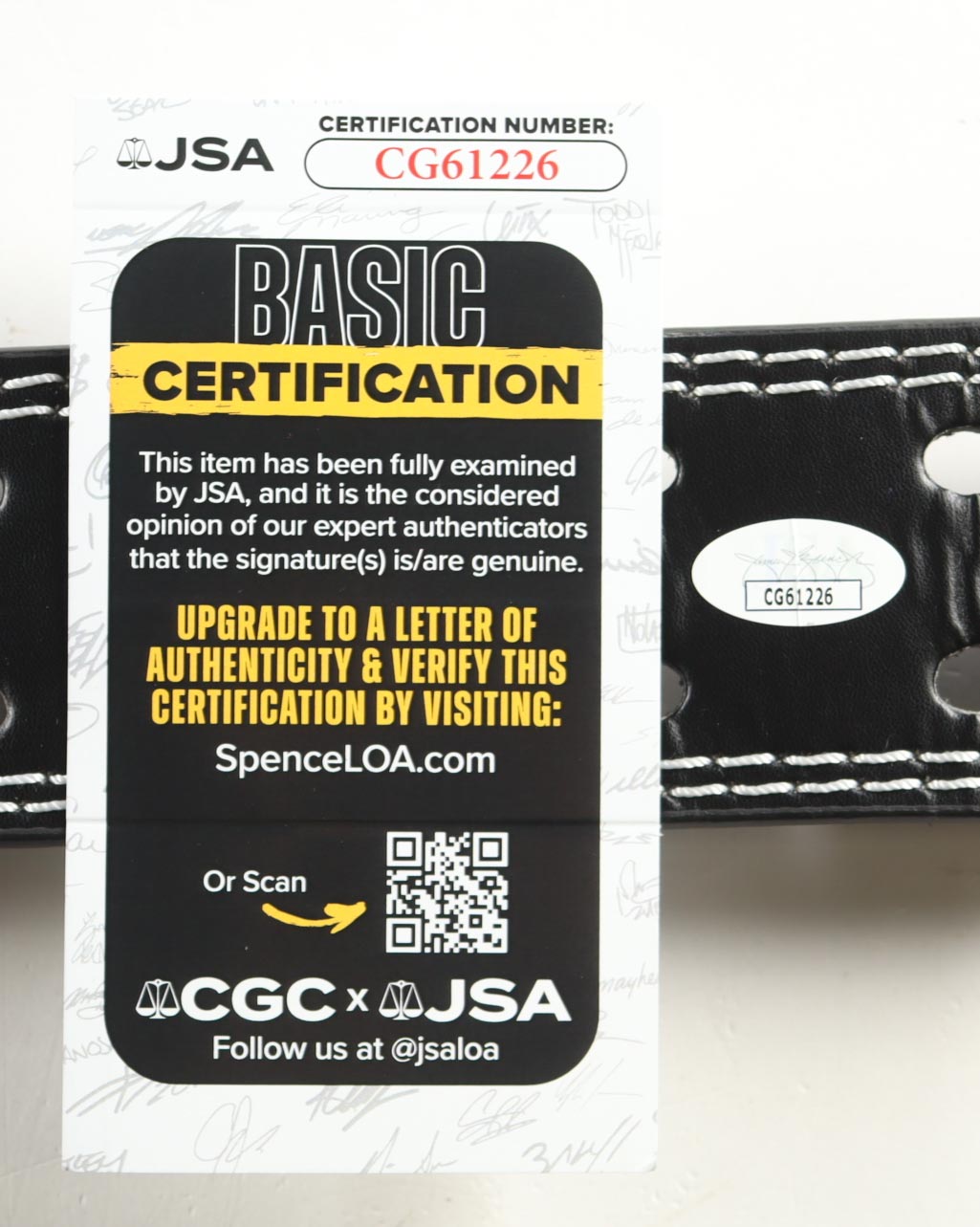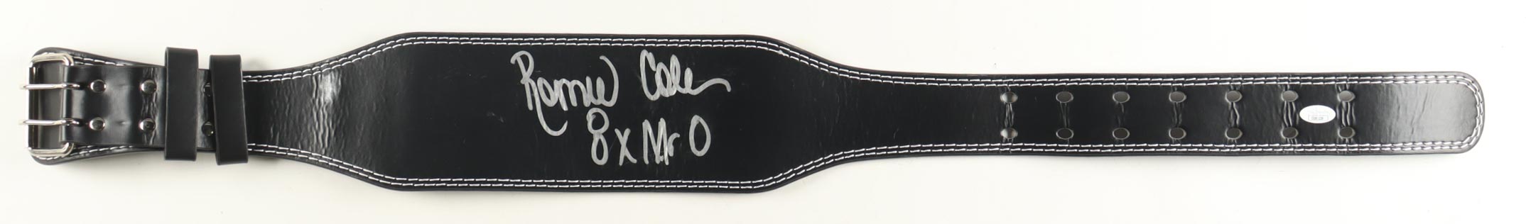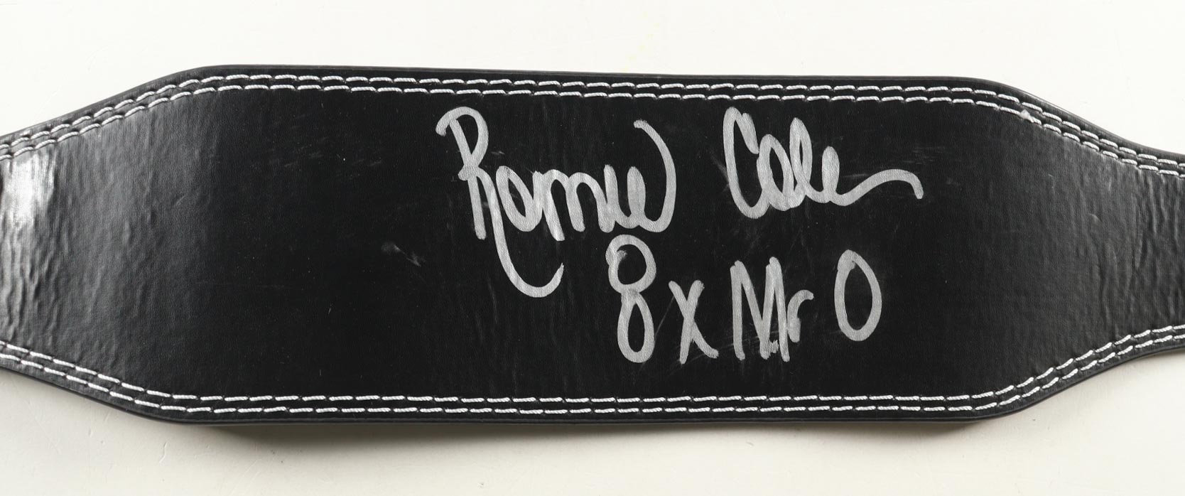 Replica leather belt measures approximately 46" in length has been hand-signed and inscribed by Ronnie Coleman (HOF). Please note, the signature ink is smudged and there is a stray ink mark on the belt.