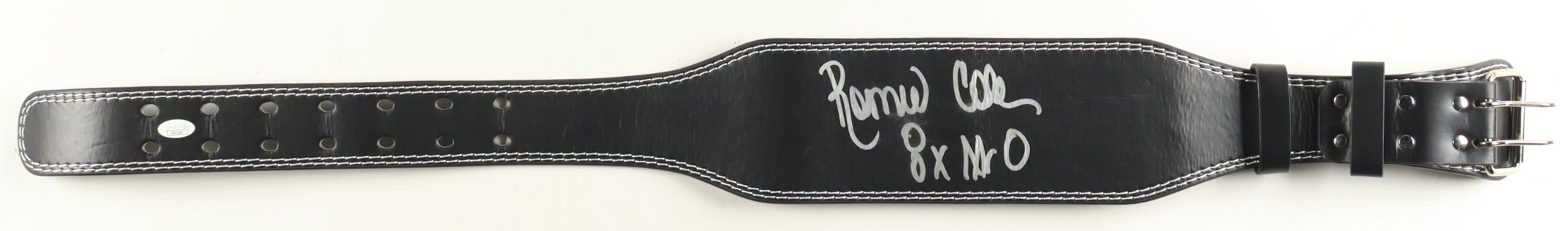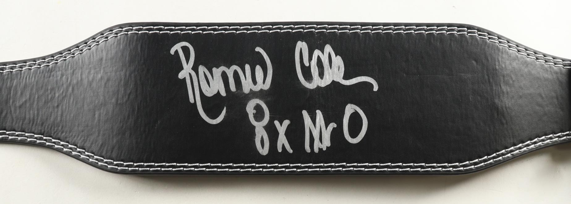 Replica leather belt measures approximately 46" in length has been hand-signed and inscribed by Ronnie Coleman (HOF). Please note, the ink is smudged.
