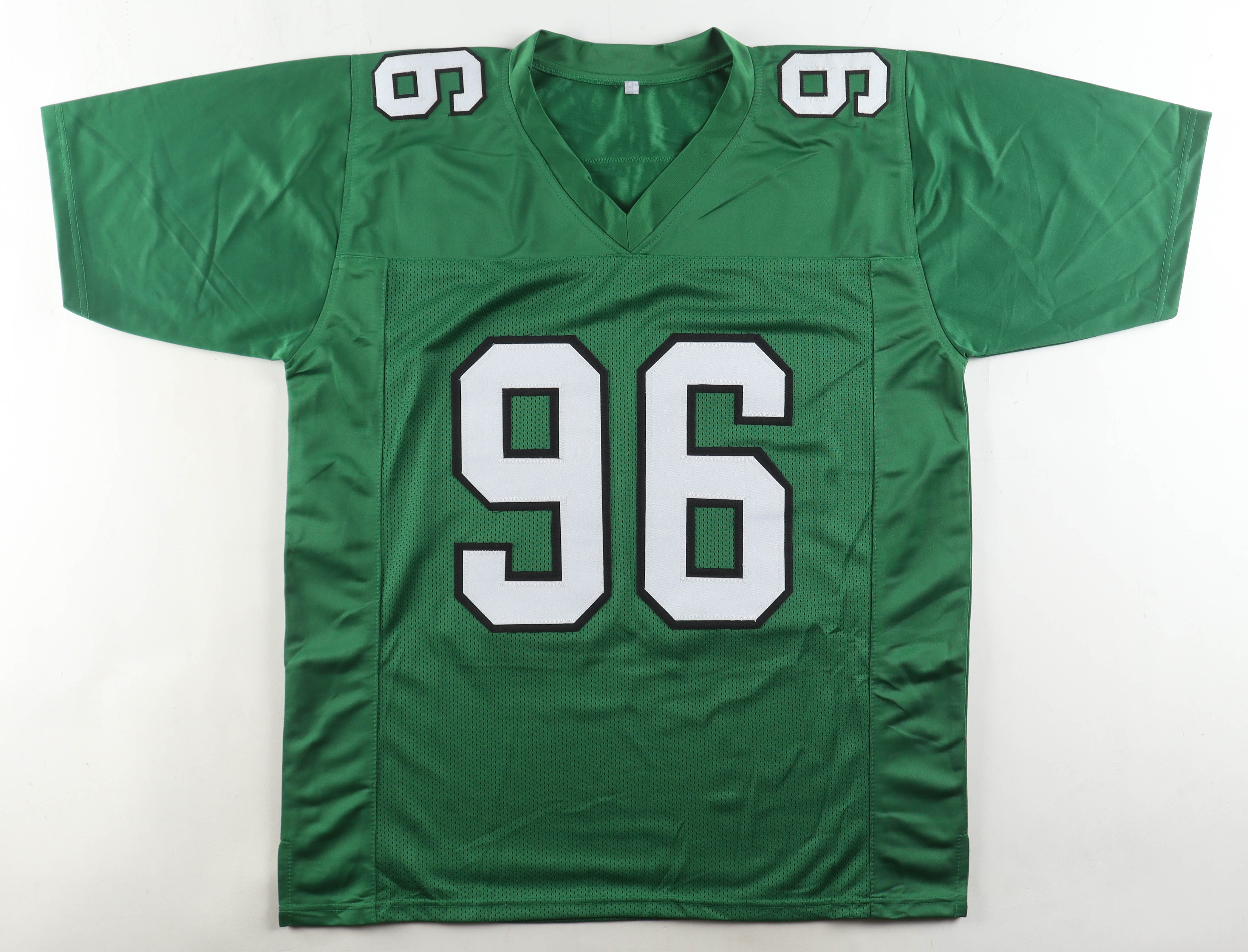 Custom jersey, everything is sewn on, size XL. Hand-signed and inscribed by Clyde Simmons. Please note, the signature and inscription have bled. See photos regarding the condition of the item.