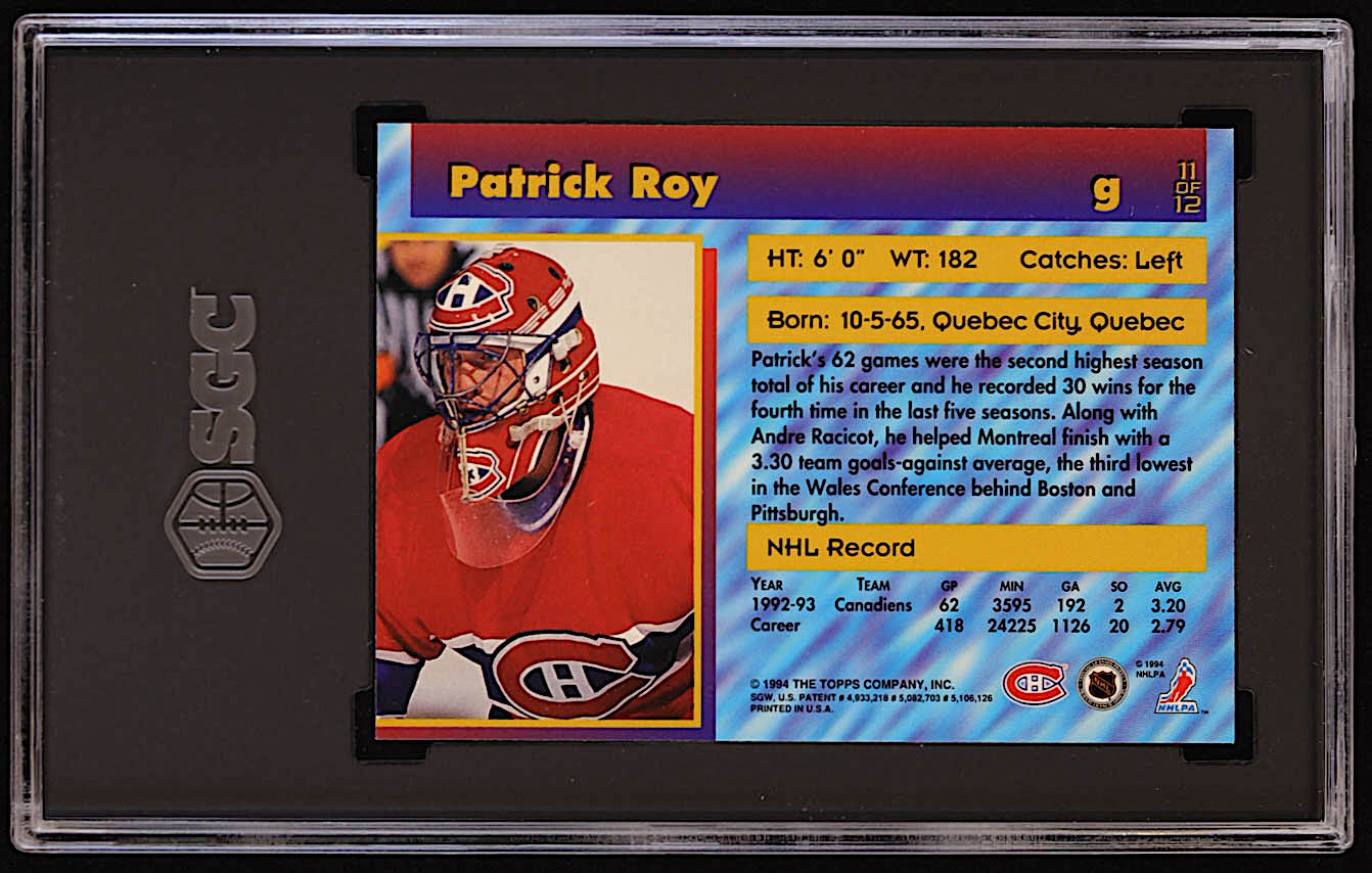 Patrick Roy 1993-94 Stadium Club Finest Inserts #11 (SGC 8)