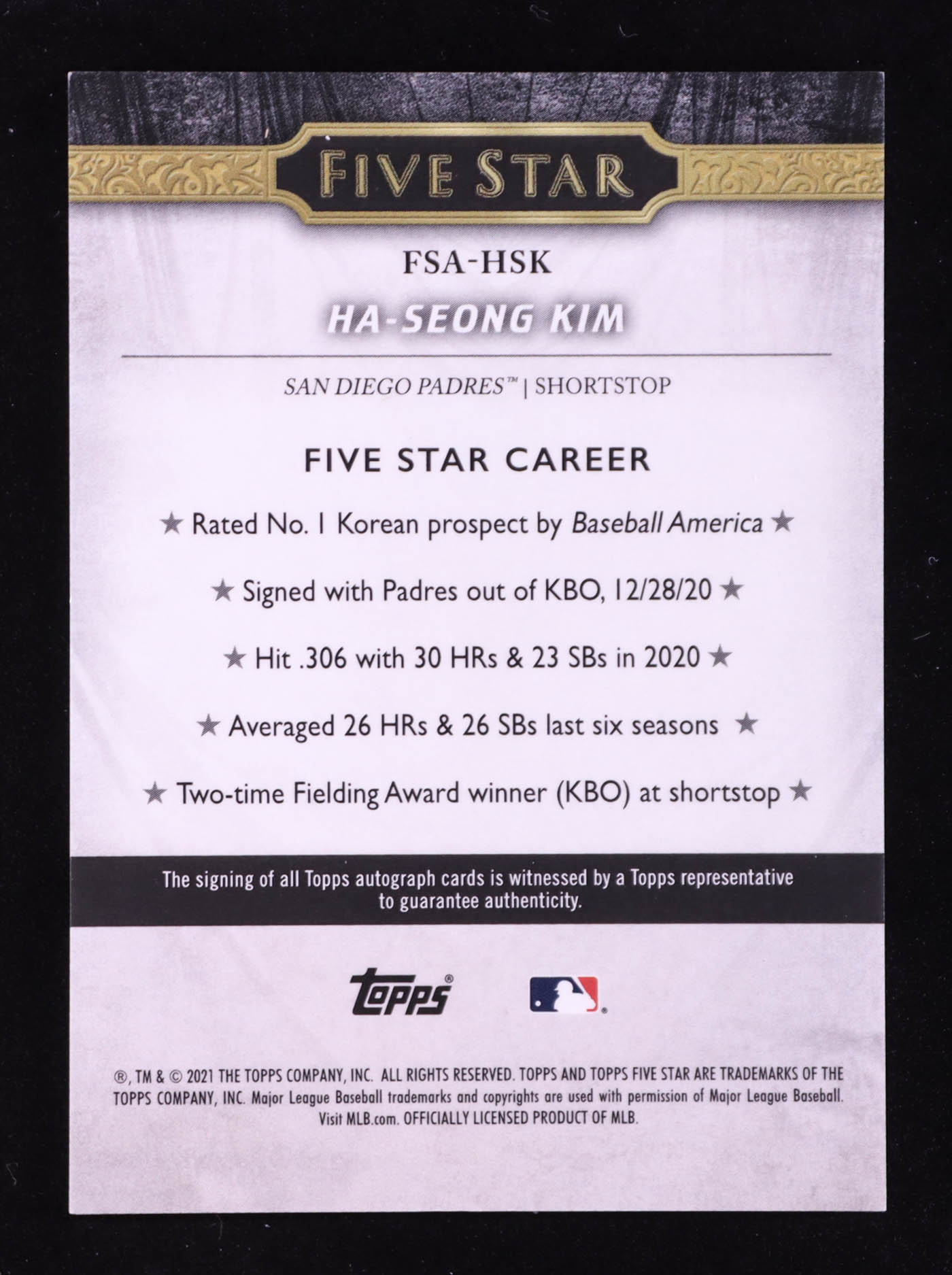 Ha-Seong Kim 2021 Topps Five Star Autographs #FSAHSK RC