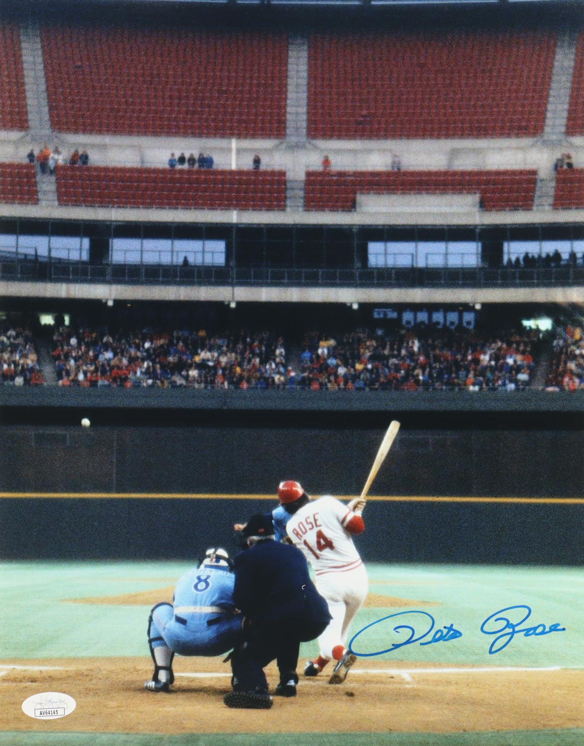 Photo measures 11" x 14" in size. Hand-signed by Pete Rose (D. 2024, Cincinnati Reds).