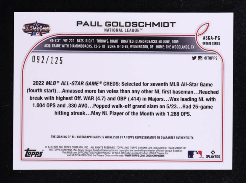 Paul Goldschmidt 2022 Topps Chrome Update '22 All Star Game Autographs X-Fractors #ASGAPG #092/125