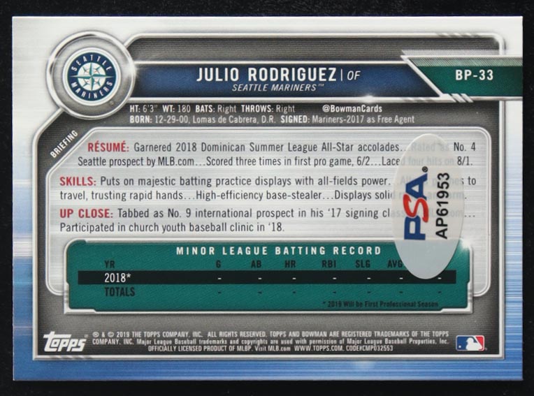 Julio Rodriguez Signed 2019 Bowman Chrome Prospects #BCP33 RC Inscribed "JRod" (PSA)