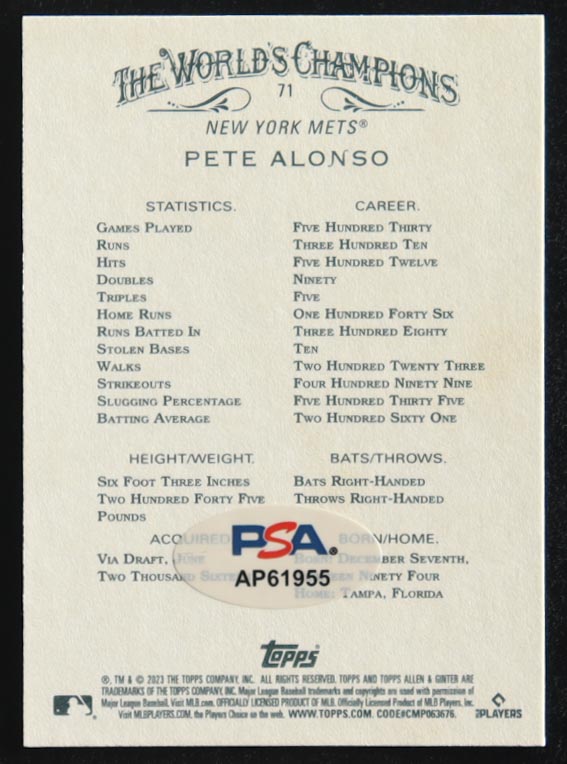 Pete Alonso Signed 2023 Topps Allen and Ginter #71 (PSA)