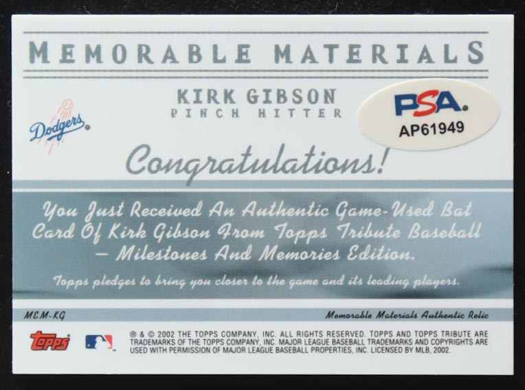 Kirk Gibson Signed 2002 Topps Tribute Memorable Materials #KG (PSA)