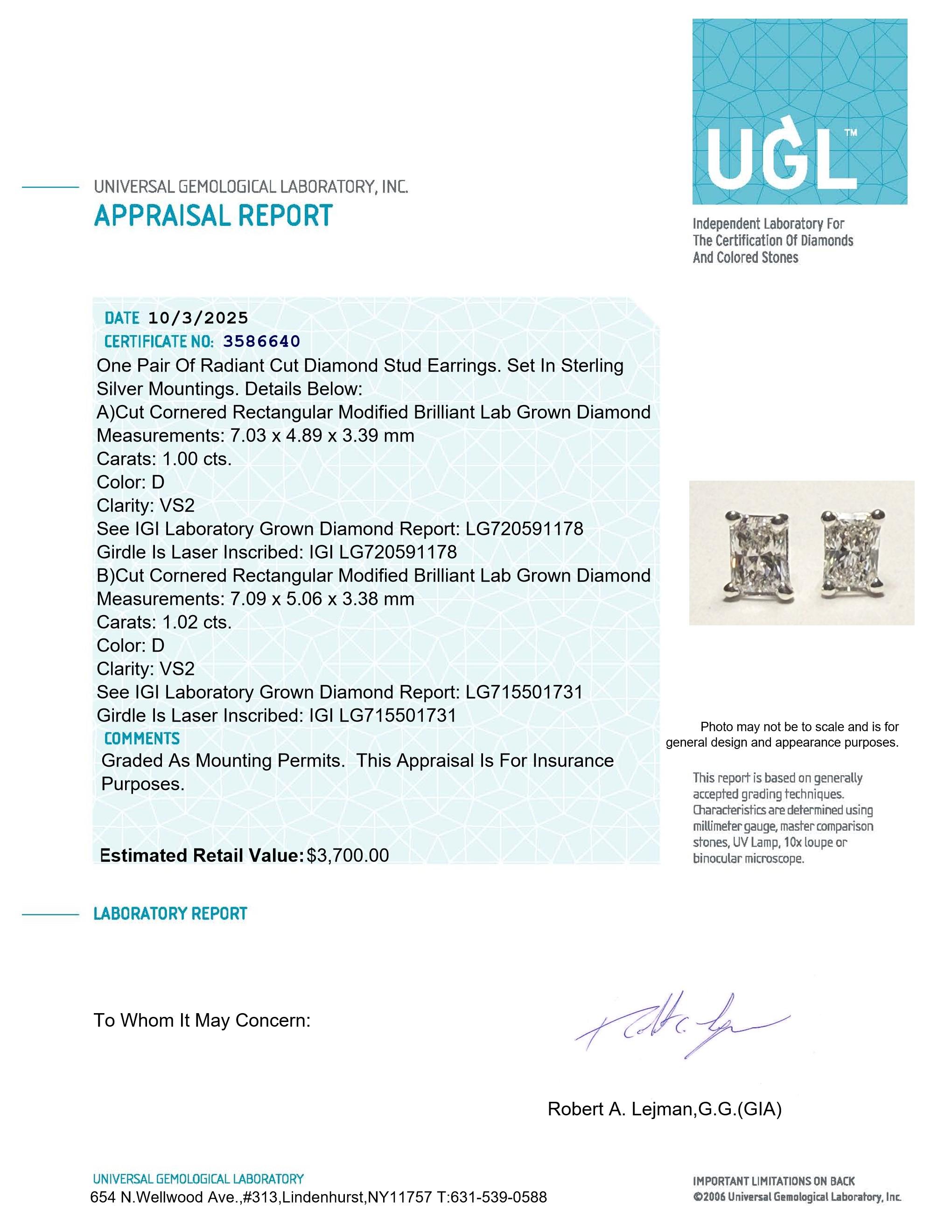 New 2.02 CTW Lab Grown Pair of Diamond Earrings D, VS2 | Estimated Retail Value: $3,700 (UGL & IGI)