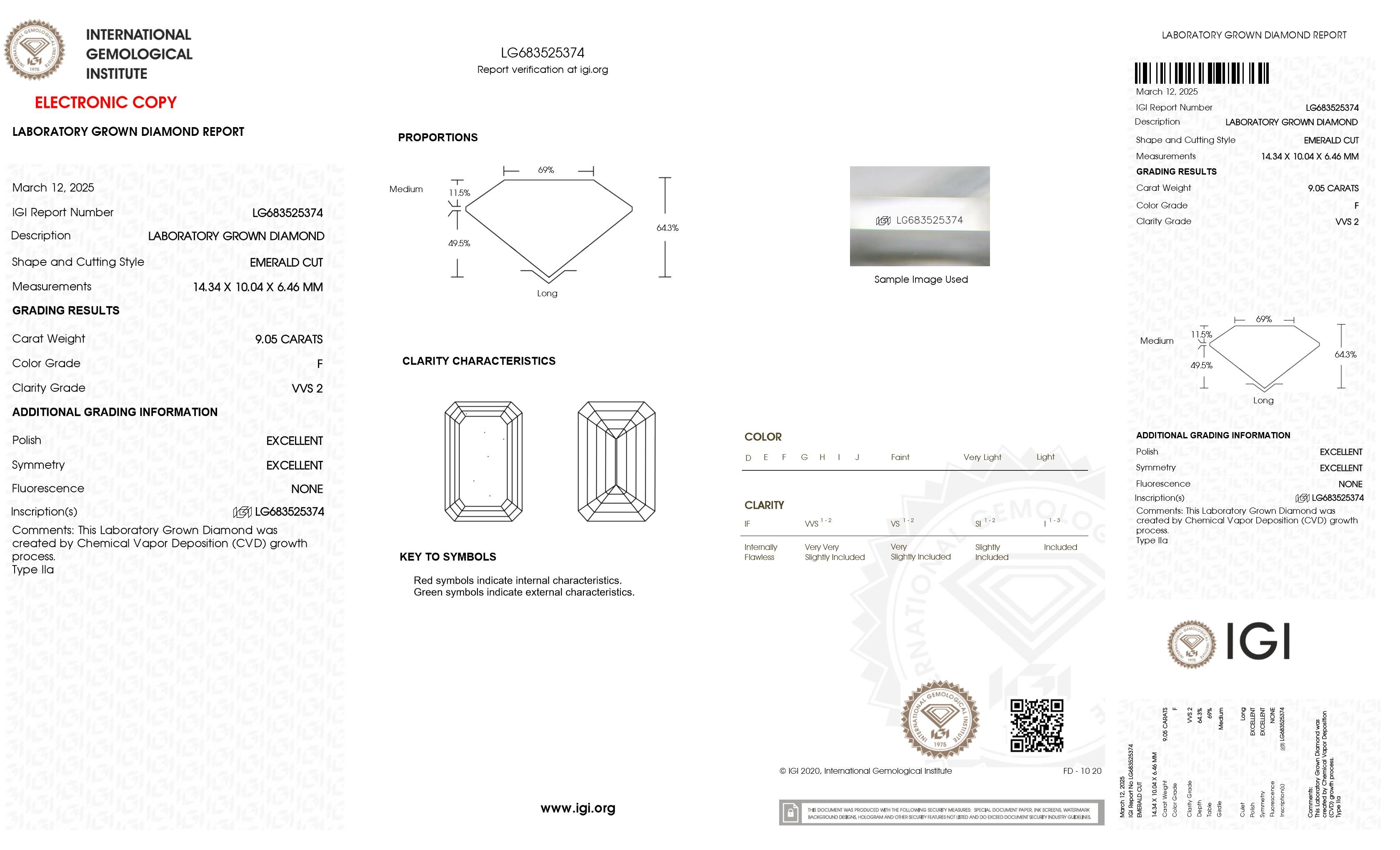This piece includes paperwork from the International Gemological Institute (IGI) and Universal Gemological Laboratory (UGL).