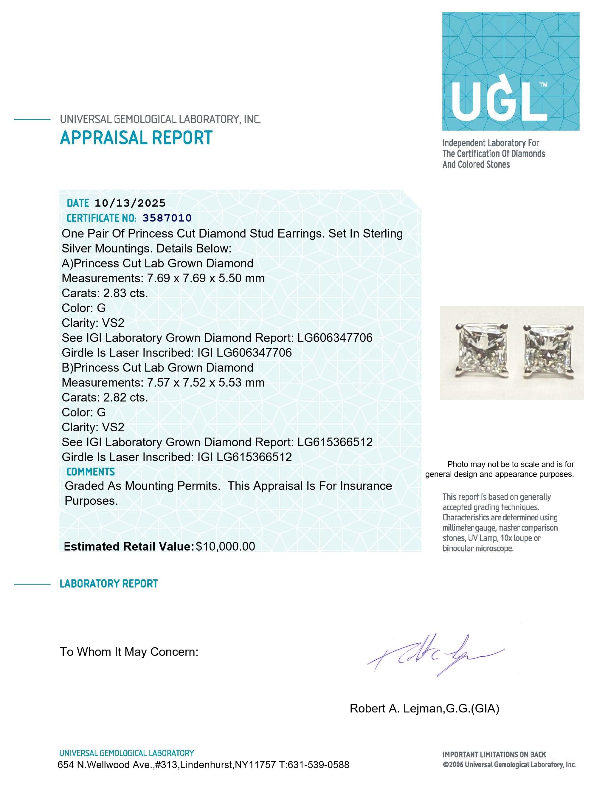 New 5.65 CTW Lab Grown Pair of Diamond Earrings G, VS2 | Estimated Retail Value: $10,000 (UGL & IGI)