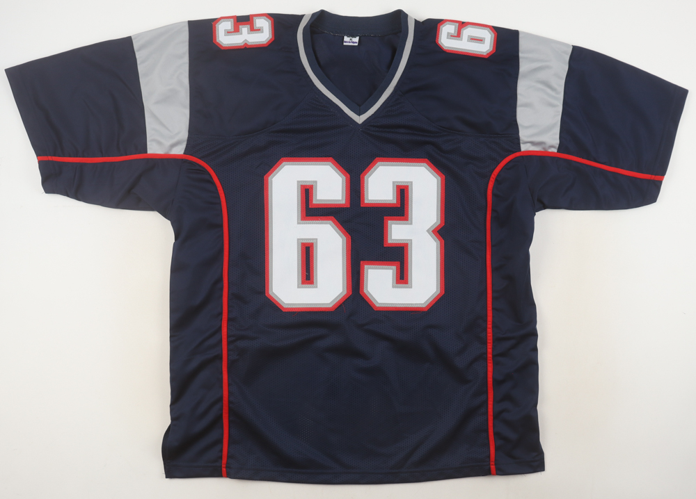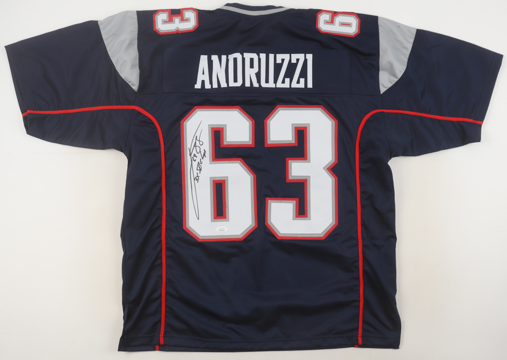 Custom jersey. Everything is sewn on, size XL. Hand-signed and inscribed by Joe Andruzzi.