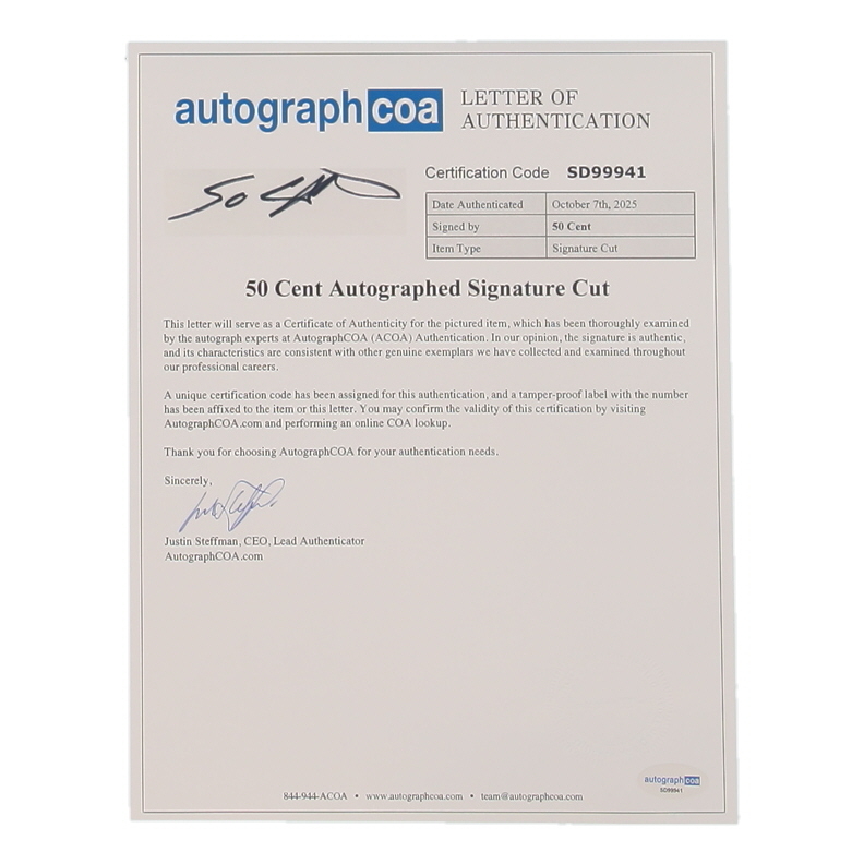 Custom photo display measures approximately 11" x 14" in size and features a cut that has been hand-signed by 50 Cent.