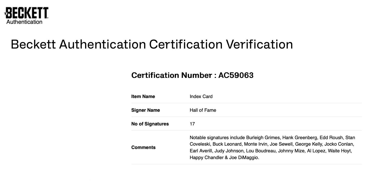 Index Card measures 4” x 6” in size and has been hand-signed by (17) members of the baseball Hall of Fame including Joe DiMaggio, Hank Greenberg, Burleigh Grimes, Edd Roush, Stan Coveleski, Buck Leonard, Monte Irvin, Joe Sewell, George Kelly, Jocko Conlan, Earl Averill, Judy Johnson, Lou Boudreau, Johnny Mize, Al Lopez, Waite Hoyt, and Happy Chandler!
