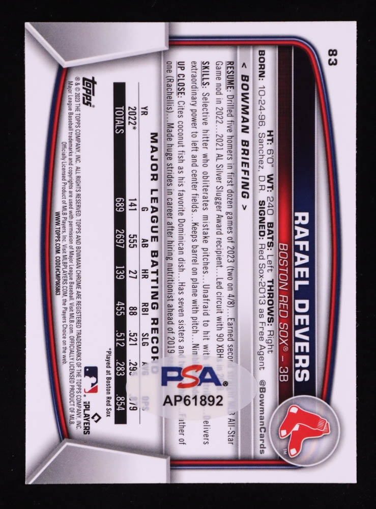 Rafael Devers Signed 2023 Bowman Chrome #83 (PSA)